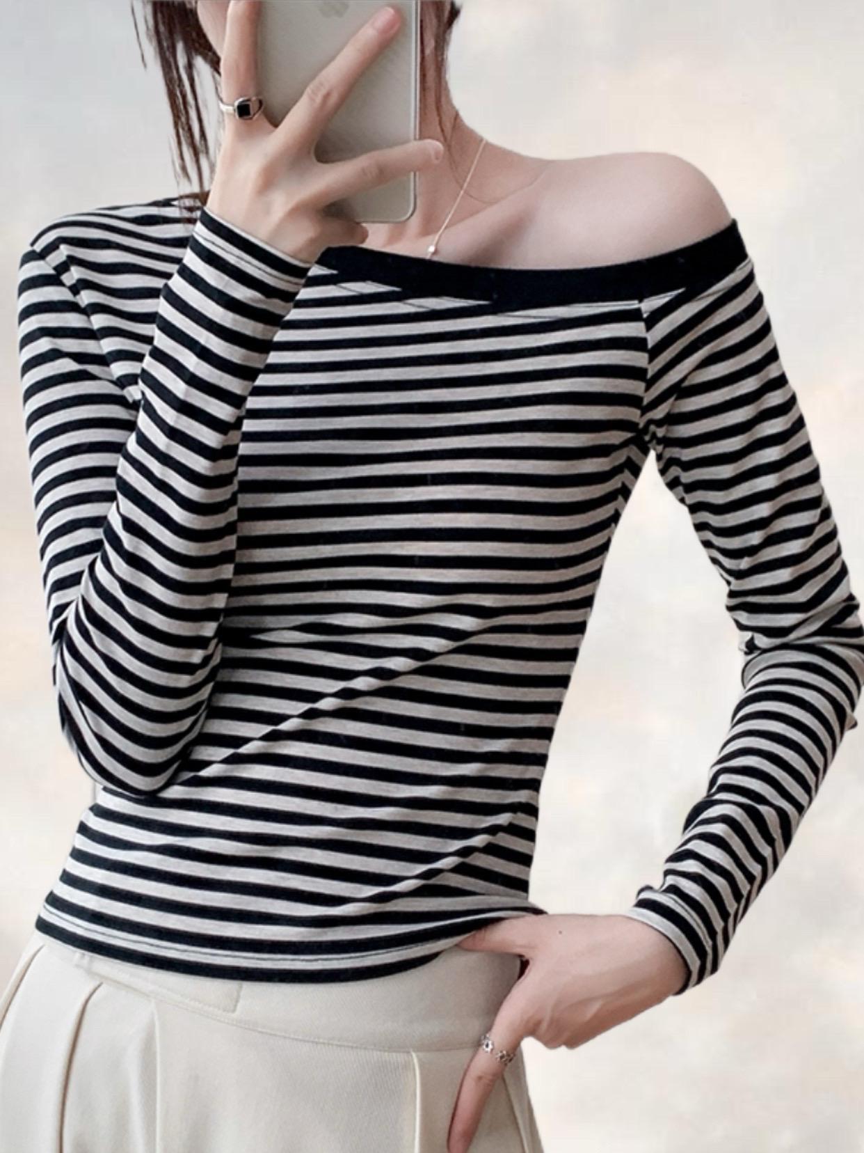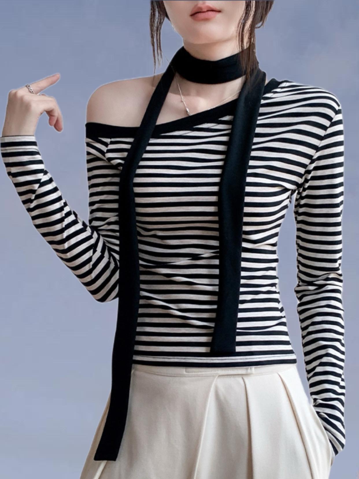 上衣上衣穿搭秋季新款长袖打底衫斜肩上衣