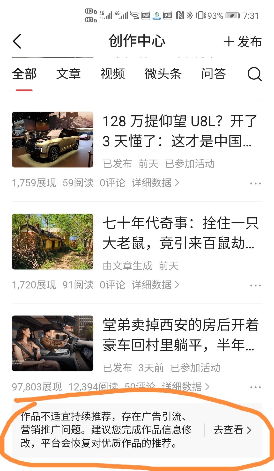 头条作者们注意啦,你的作品不符合人设要求,小心被限流。这个教训我已替你们体验过了。 我是从2022年3月起在头条开始创作的,坚持了一年后,由于种种原因,断断续续地写写停停。从问答到长文,积攒了将近3万粉丝。 一开始我主要是写一些农村人文故事,后来基本转成旅游方面,当然也会写一些人文故事。 从5月起,我断更了。一直持续到今年9月18日重新开始。 写过几个旅游方面的长文,感觉不是太理想,看到汽车征文还不错,于是我就通过一个小故事,写了一个汽车征文长文。没有想到,居然一下子有了一万多阅读量。 正当我高兴之际,却突然收到一条消息:审核提醒:作品不适宜持续推荐,存在广告引流、营销推广问题。建议您完成作品信息修改,平台会恢复对优质作品的推荐。 我猜可能许多读者认为我的作品是软广告,虽然我在评论区留言,这是参加征文活动,但最终没有逃脱这个结果。 正好我看到一则关于七十年代老鼠的故事,于是我把自己曾经听到的关于农村人怎么斗老鼠的故事又写了出来。 没有想到这个小作文竟然也获得了一万多个阅读量。 也是正当然高兴之际,突然又收到一个消息,审核提醒:作品不适宜持续推荐,作品存在恶俗、负向、情节编造的表述,观感不佳。建议您完成作品信息修改,平台会恢复对优质作品的推荐。 同时认为我的人设不符合文章要求。 唉,几个月不在平台上写作,没有想到,竟然变成了这个样子。 重新回归头条,本想借着过往的创作底子再续热度,没成想两次流量小高峰后,都栽在了 “人设” 和内容合规上。 从前写农村人文、旅游内容顺风顺水,如今随意切换赛道、触碰不熟悉的题材,既打乱了平台对账号的定位,也容易踩中内容红线。 往后再创作,可得把 “人设一致” 刻在心里,专注自己熟悉的领域,不盲目跟风追热点,更不编造内容博眼球。 毕竟,账号的长期价值,从来都靠清晰的定位和优质的内容支撑。与其在多个赛道来回碰壁,不如在擅长的领域深耕到底,才是在平台长久走下去的关键。