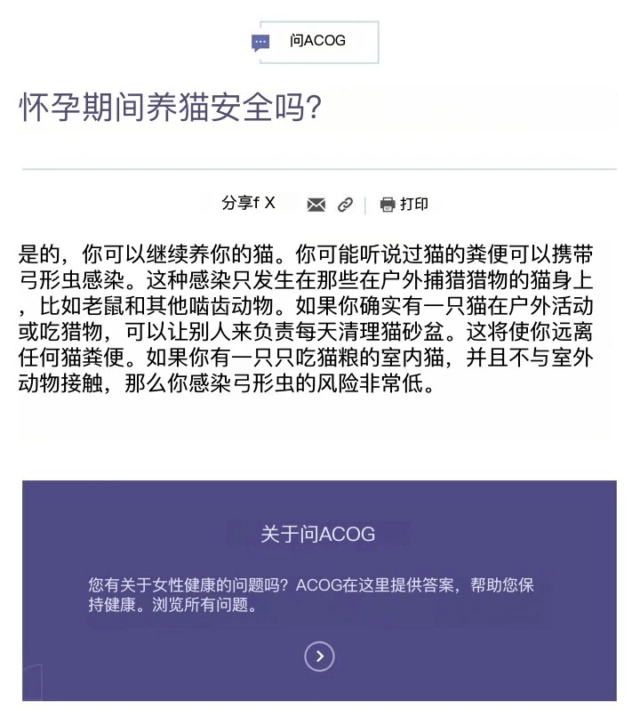 当年我老婆怀孕时我家也是正常养猫,啥事没有。 当然个人经验不能说明问题,请看权威机构的解释。附图是ACOG(美国妇产科医师学会)的建议。 简单翻译一下。原文英文难度不会超过高中水平。 ******* 问:怀孕期间养猫是否安全? 答:是的,你可以继续养你的猫。 你可能听说过猫的粪便会携带弓形虫感染,但这种感染只发生在那些在户外捕猎的猫身上,比如捕猎老鼠和其他啮齿类动物。如果你确实有一只猫在户外活动或捕猎,可以让别人来负责每天清理猫砂盆,这将使你远离猫粪便。 如果你有一只只吃猫粮的室内猫,并且不与室外动物接触,那么你感染弓形虫的风险非常低。 ******* 这个回答已经说得很明确了。那些一怀孕就在家里人压力下把猫送走的,我只能说要么是缺乏传染病常识,要么是在家里毫无话语权,苦难的日子还在后头。
