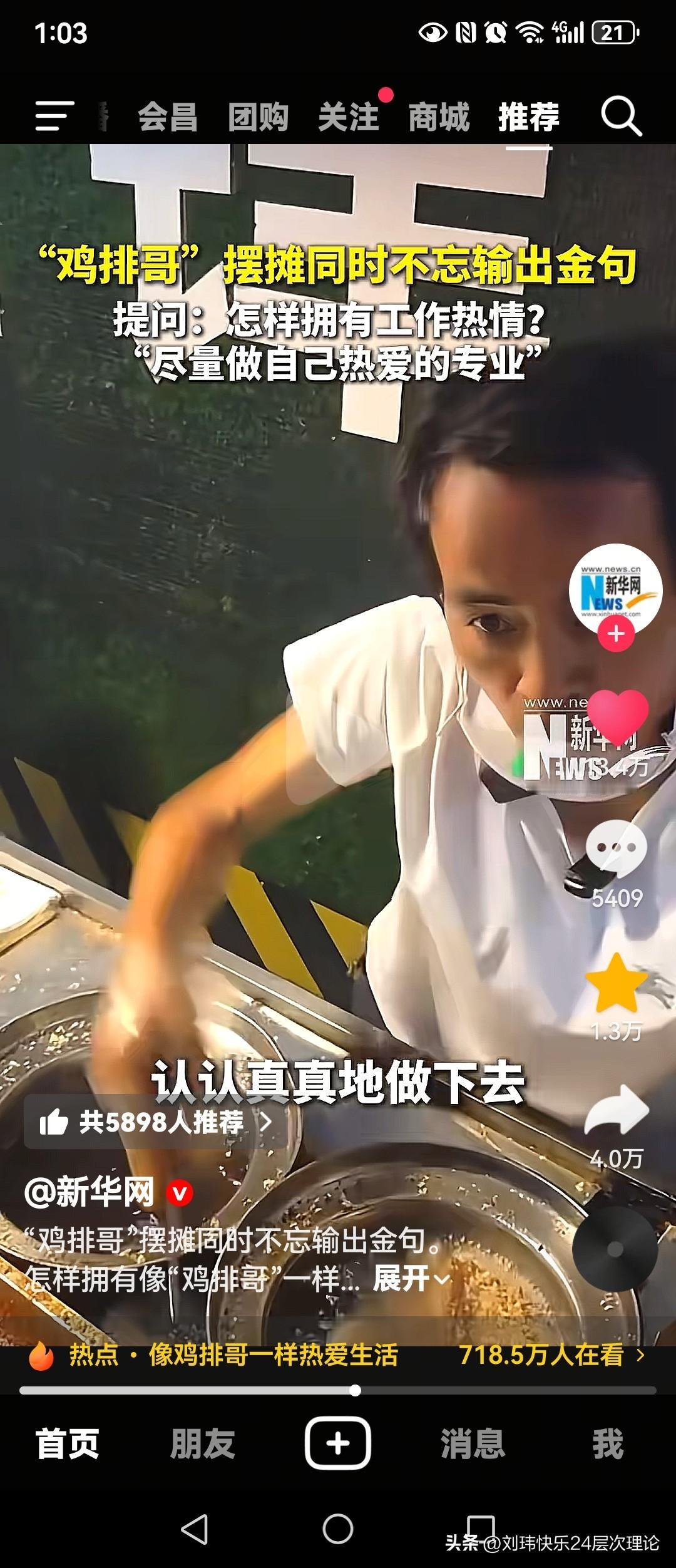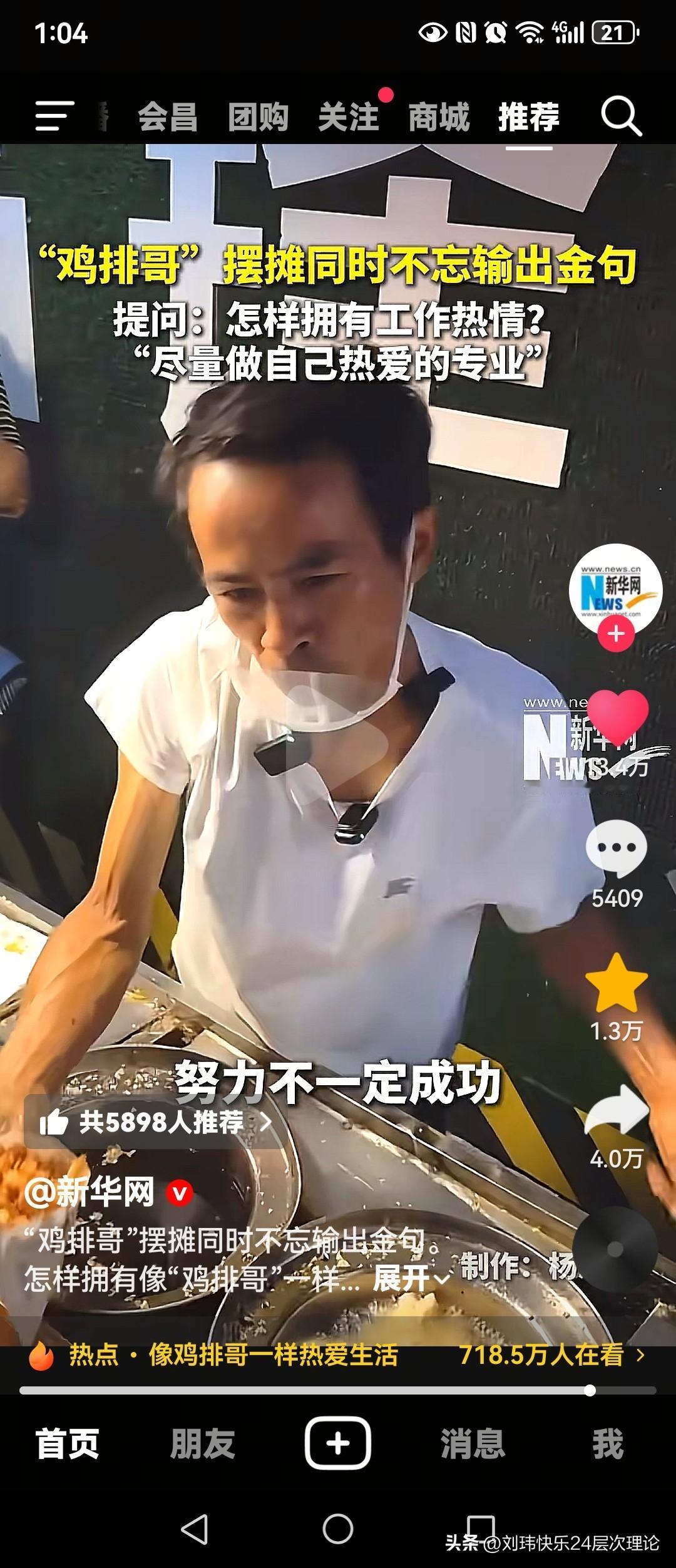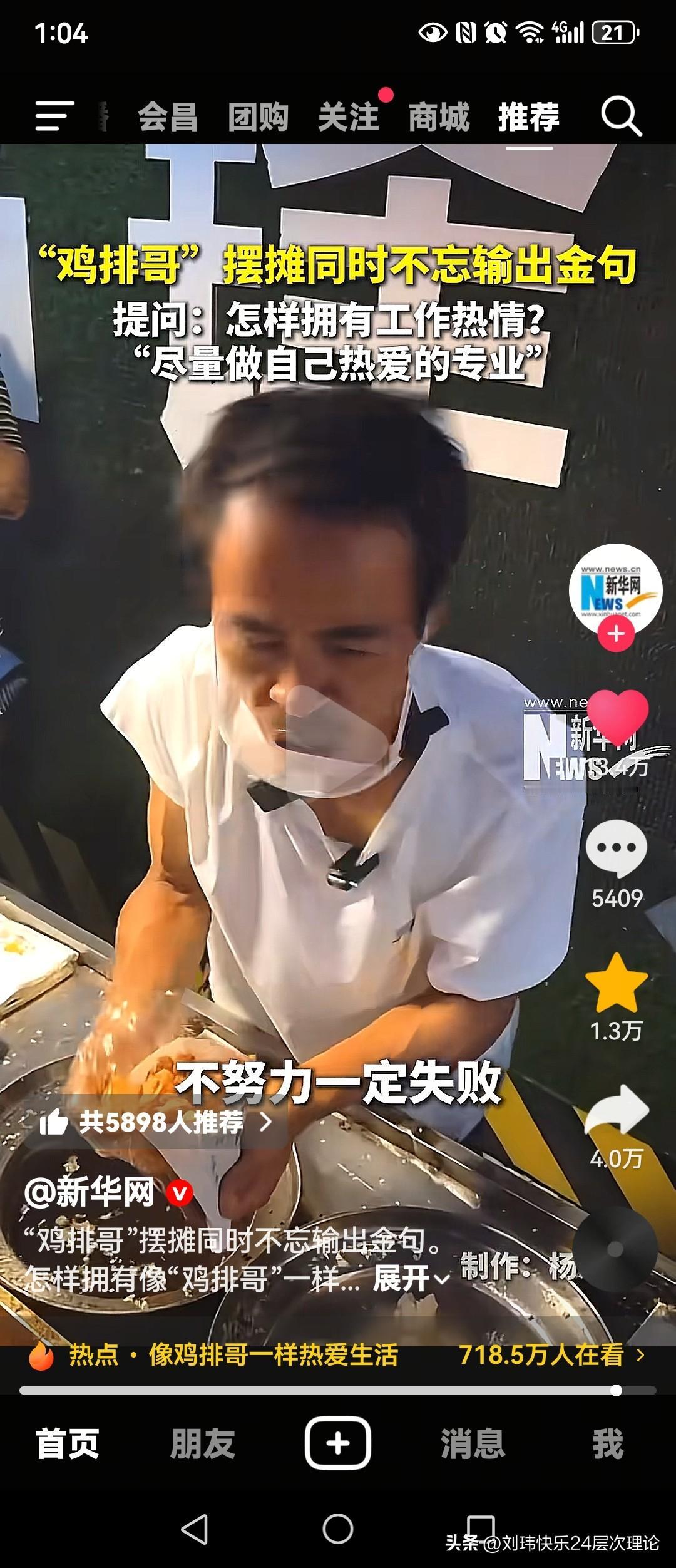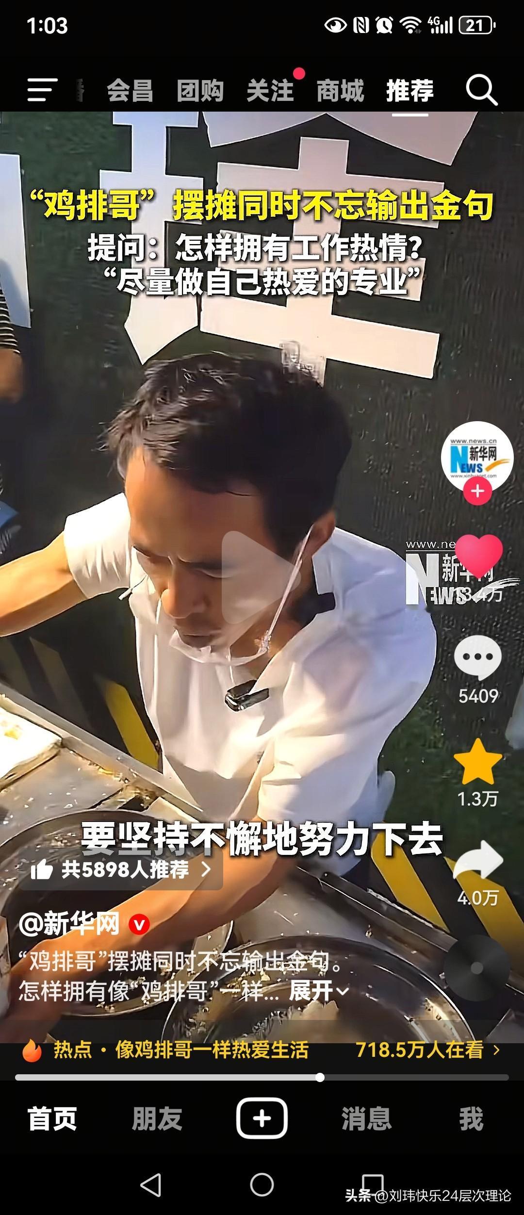 刚刚在抖音看到了江西景德镇“鸡排哥”摆摊同时不忘输出金句。记者提问:“怎样拥有工