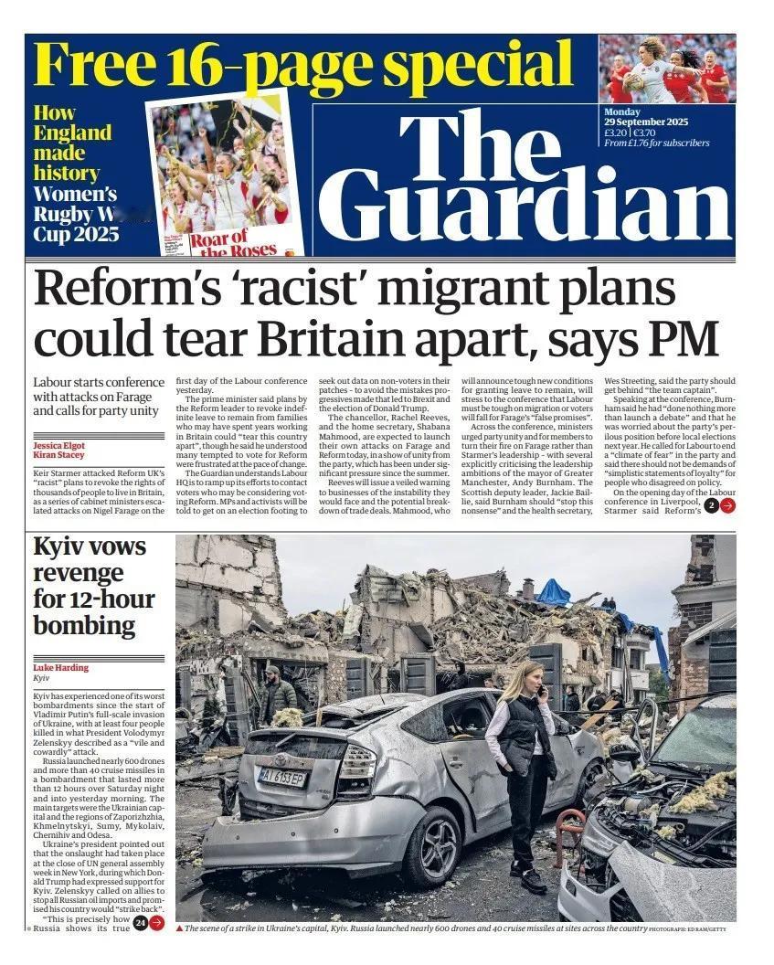 《卫报》报道,英国首相基尔·斯塔默先生攻击了英国改革党撤销数千人居住在英国权利的“种族主义”计划,同时一系列英国内阁部长在工党大会第一天升级了对英国改革党领导人(英国版特朗普)奈杰尔·法拉奇的攻击。