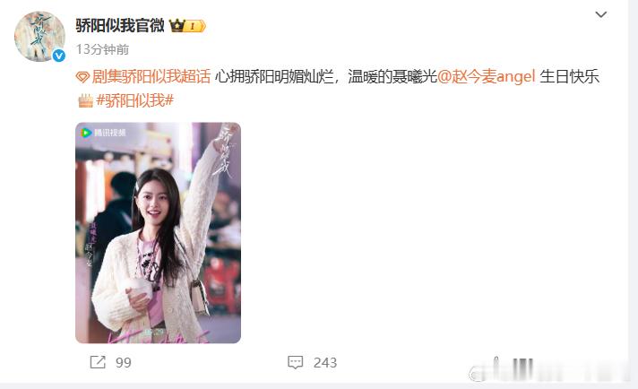 赵今麦生日之际,《骄阳似我》通过发布生日剧照和送上祝福表达诚意,这样的用心让粉丝