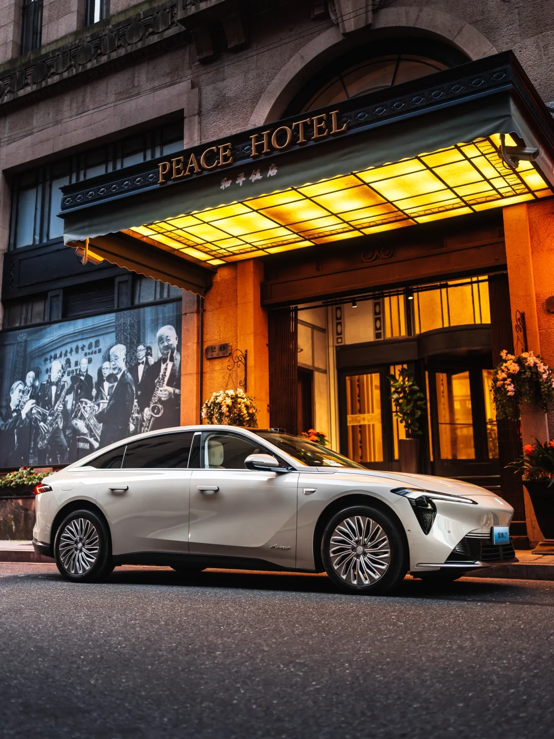 2️⃣随后我们导航到和平饭店,这里橘黄色的暖光和蓝调时刻的色调相呼应拍出青橙色调的照片很轻松