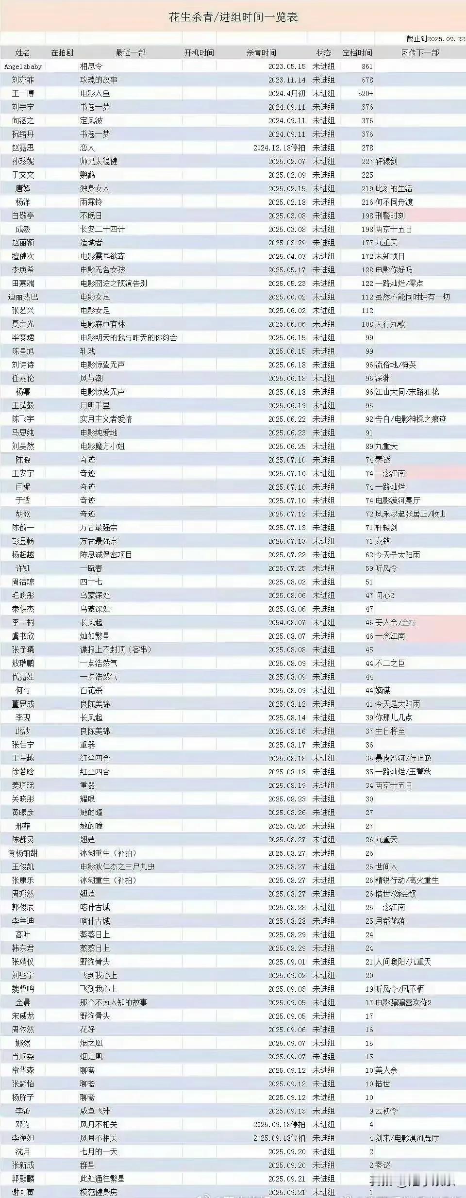 那些经常抠脚的人都怎么样了? 明星“抠脚”时长大比拼 - Angelababy:空窗861天,《相思令》后暂无新组动态,网传或接触都市剧《霓虹深处》。 - 刘亦菲:空窗678天,《玫瑰的故事》口碑热播后,有望接拍古装大剧《咸雪》,搭档刘学义。 - 王一博:空窗超520天,《人鱼》杀青后参与纪录片《探索新境2》拍摄,时尚商务活动持续。 - 刘宇宁、向涵之、祝绪丹:空窗376天,三人同因《书卷一梦》杀青,刘宇宁等好剧本,向涵之有《定风波》待播。 - 赵露思:空窗278天,《恋人》停拍后暂未进新组,粉丝盼其快速回归。 - 白敬亭、成毅:空窗198天,白敬亭或将拍《刑警时刻》,成毅有望加盟《两京十五日》。 - 迪丽热巴、张艺兴:空窗112天,二人同拍《女足》后,迪丽热巴有《虽然不能同时拥有一切》待播,张艺兴影视音乐双线发展。 - 邓为、李宛妲:空窗4天,《风月不相关》停拍后,邓为或接《漠河舞厅》,李宛妲可能加盟《剑来》。 - 沈月、张新成:空窗2天,沈月《七月的一天》后迅速有新动作,张新成从《群星》无缝衔接《秦谜》。 - 谢可寅:空窗1天,《模范健身房》后即刻开工,职业活跃度极高。 - 谢可寅:1天,《模范健身房》后即刻开工