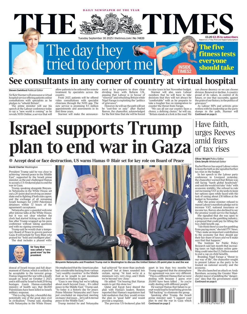 《泰晤士报》报道,唐纳德·特朗普表示,他希望实现“中东永久和平”,以色列总理本杰明·内塔尼亚胡对此表示支持,两人同时呼吁哈马斯接受美国调解的加沙战争结束计划。 另外,美国总统特朗普29日在白宫会见以色列总理内塔尼亚胡。 据白宫称,特朗普在会晤期间与卡塔尔首相兼外长穆罕默德进行了三方通话,而内塔尼亚胡则对以色列袭击多哈表示遗憾。 据白宫透露,内塔尼亚胡在通话中对以色列侵犯卡塔尔主权表示遗憾,并承诺不再实施此类袭击。 以色列总理办公室和卡塔尔外交部也证实了内塔尼亚胡的说法。 本月9日,以色列在卡塔尔首都多哈对伊斯兰组织哈马斯领导人进行了空袭。