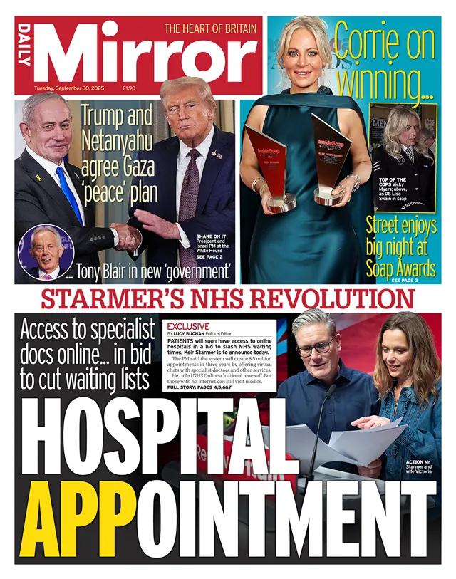 《每日镜报》还以一篇关于唐纳德·特朗普和本杰明·内塔尼亚胡达成的加沙“和平”计划的报道为头条。 此外,它还刊登了一篇独家报道,预计英国基尔·斯塔默爵士将宣布推出一项名为“NHS Online”的新服务,该服务计划从2027年开始,旨在创造数百万个新预约并消除长期等待治疗的现象。 简而言之,面对英国医院,诊所漫长的等待就诊时间,英国政府推出预约制度来缓解就医等待时间的问题。