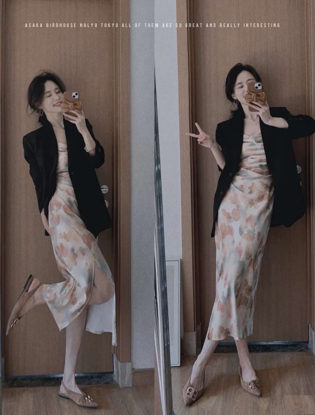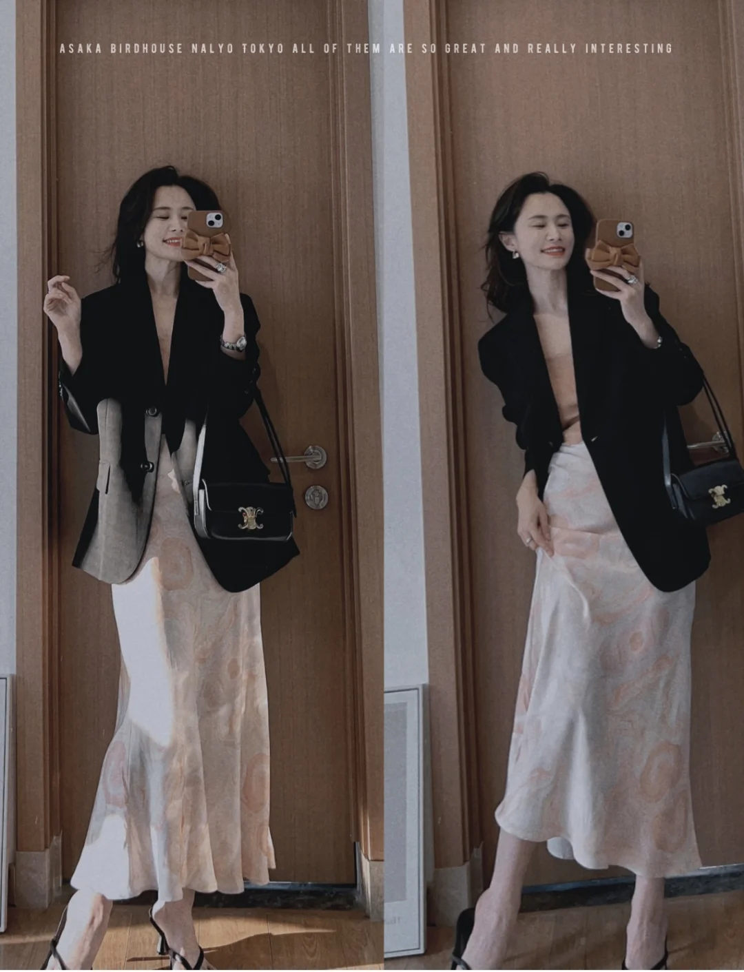建议用裸色或者波点连衣裙来搭配黑色西装,或者碎花连衣裙也是能够打造出清新感的,让黑色西装的造型看上去不会太单调。