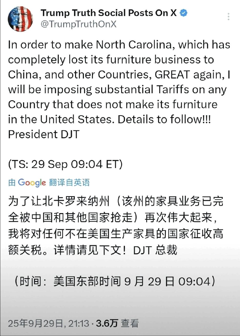 2025年9月29日,特朗普宣布对未在美国生产家具的国家加征高额关税,矛头直指中国和越南——两国占美国家具进口总额的60%(2024年达255亿美元),其中越南占美国木制成品进口超40%。此举宣称要重振北卡罗来纳州等传统家具制造州,但现实矛盾重重:美国本土家具制造成本高企(售价普遍比中国产品高30%-40%),且产业链严重依赖进口木材(美国58%土地为林地但70%加工环节外包)。历史数据显示,2019年对华家具加征25%关税后,美国本土产量反降3%,而家具价格飙升22%。若新关税落地,普通家庭购买卧室家具成本或增加600美元,同时将推高美国房地产建造成本12%-15%。更深层矛盾在于,美国42%的进口家具使用美国木材原料,形成“双向征税”困局,而中国家具企业已加速向墨西哥、印尼转移产能以规避风险。个人认为,特朗普的关税政策本质是用20世纪产业思维解决21世纪全球化分工问题,忽视技术迭代(中国智能家居专利占全球42%)和成本优势(中国家具出口均价仅为美国本土1/3),最终将加剧美国通胀、抑制创新,加速全球供应链“去美国化”进程。