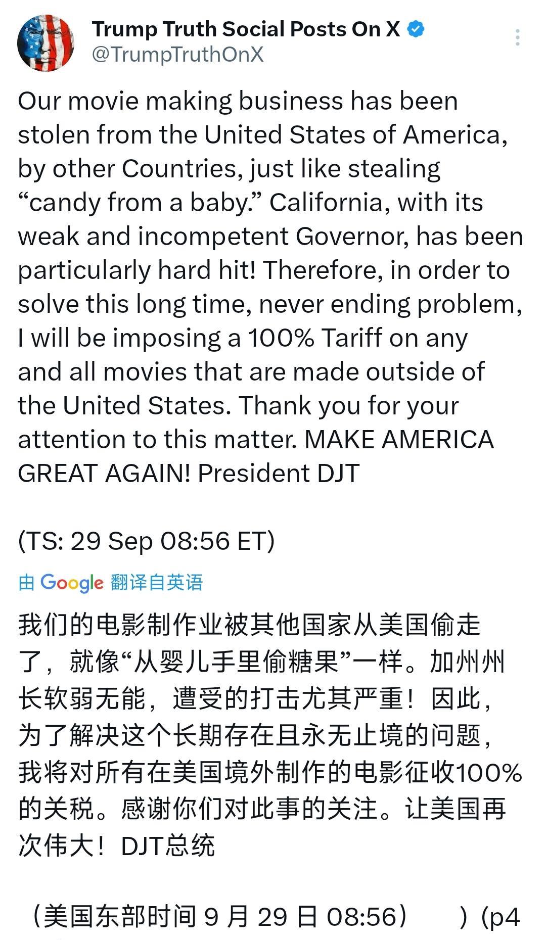 美国总统特朗普表示,将对所有在美国境外制作的电影征收100%的关税。特朗普昨晚(北京时间9月29日晚)发文写道:“我们的电影制作业被其他国家从美国偷走了,就像‘从婴儿手里偷糖果’一样。加州州长软弱无能,遭受的打击尤其严重!因此,为了解决这个长期存在且永无止境的问题,我将对所有在美国境外制作的电影征收100%的关税。感谢你们对此事的关注。让美国再次伟大!” [机智]评几句:如果真落地,那将是“闭关锁影”的荒诞闹剧。特朗普将对境外制作电影征100%关税,看似保护本土,实则自毁前程。独立导演本就靠多元合作生存,国际合拍片更是文化交流的桥梁,如此蛮干,直接将它们挤出美国市场,不但影响电影票房,创作自由也将被严重束缚。电影是艺术无国界的产物,特朗普却用关税大棒强行切割,不仅违背市场规律,更让美国电影走向“封闭”。这哪是“让美国再次伟大”,分明是让美国电影走向衰败。