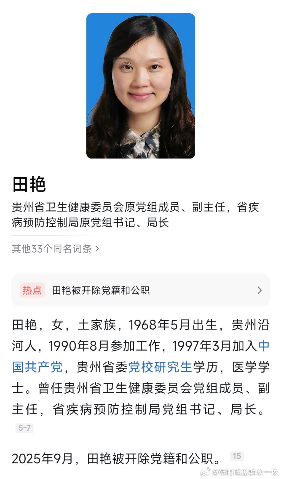 贵州省卫生健康委员会原党组成员、副主任,贵州省疾病预防控制局原党组书记、局长田艳被开除党籍和公职!热点现场