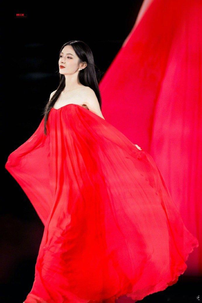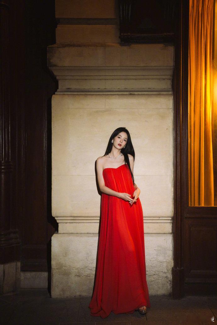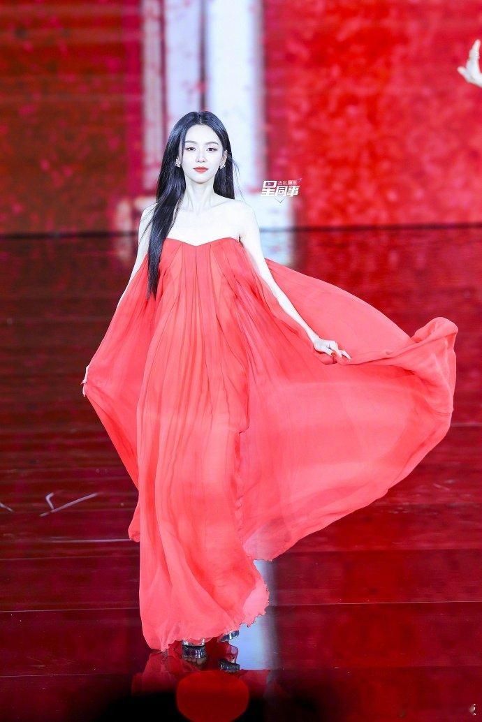 周也时装周首次走秀太稳了!一袭烈焰抹胸红裙亮相秀场,直接把松弛与灵气平衡得恰到