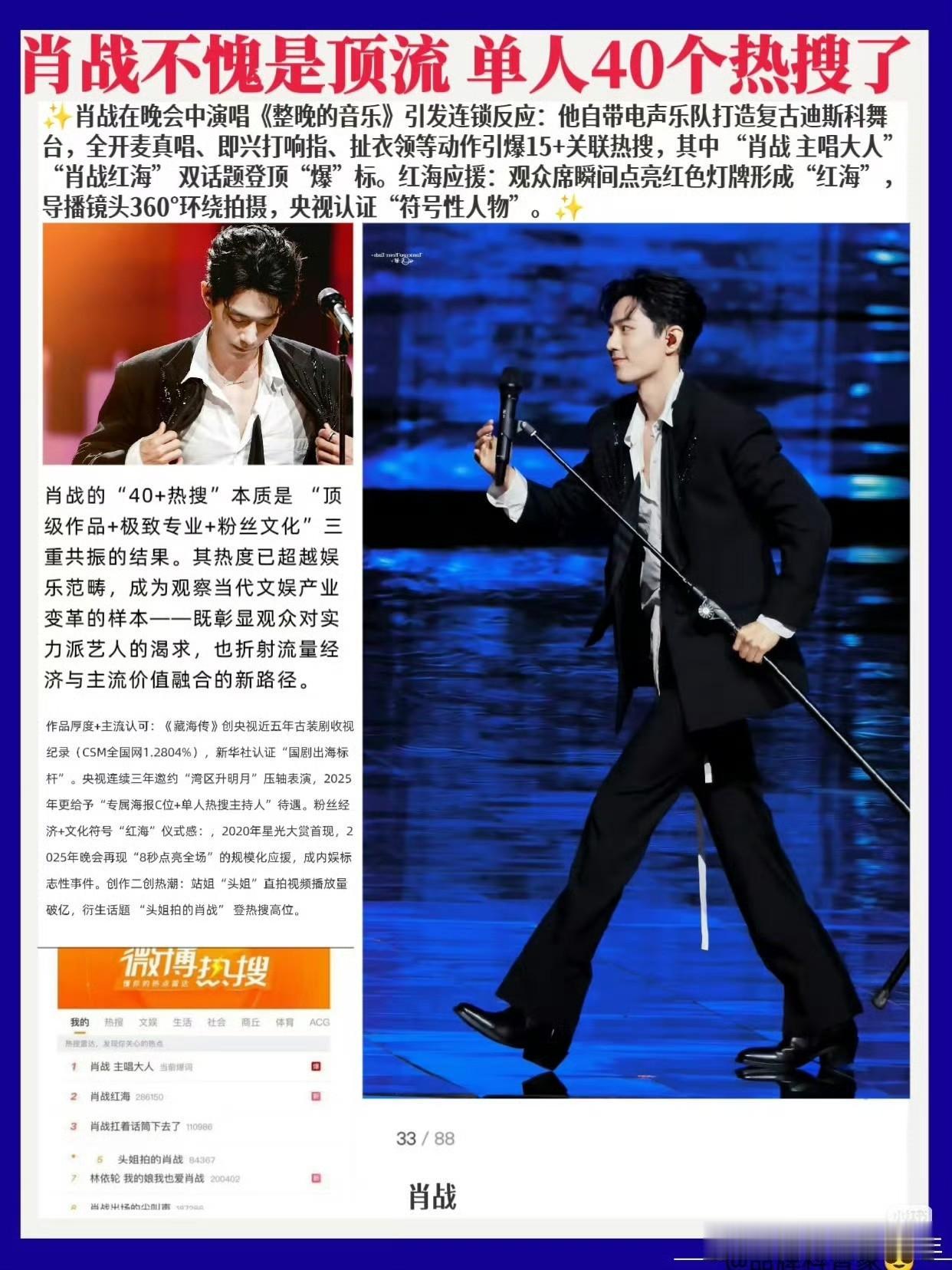 肖战大湾区晚会表演完美落幕,肖战单人热搜高达40多个,占据整场晚会90%的热度,登上世界趋势高位,单人话题爆,超话爆,舞台爆,肖战粉丝红海爆,话题热度爆,全部的目光都聚焦在巨星身上,这种几十年难遇的肖战也是内娱的传奇了。肖战用演唱实力和超绝的舞台表现力,给观众带来了一场视听盛宴。肖战值得这么盛大的爱意肖战