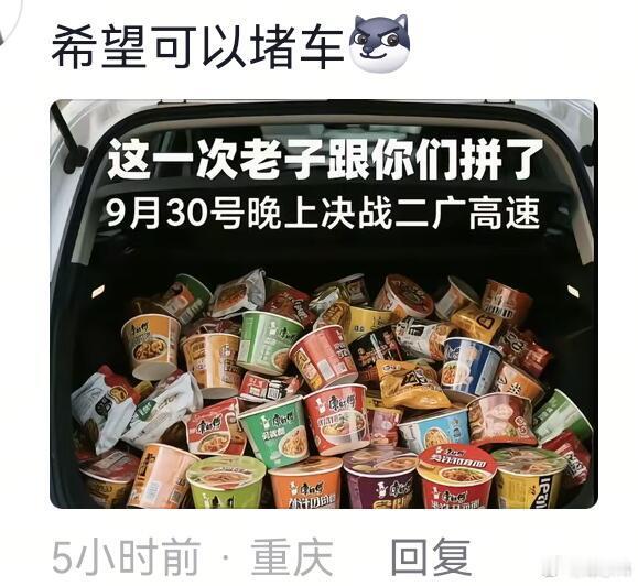我预判了你的预判,大家都预判了你的预判,就算你是26号出发,也一定有比你更早出发的人,结果就是大家好巧不巧的都堵在了路上。现在已经有很多高速沿途的居民出来摆摊了,卖点面包香肠饮料,有手艺的还能现炒个炒饭炒粉炒粉,大家就等着看乐子吧~[馋嘴][馋嘴][馋嘴]