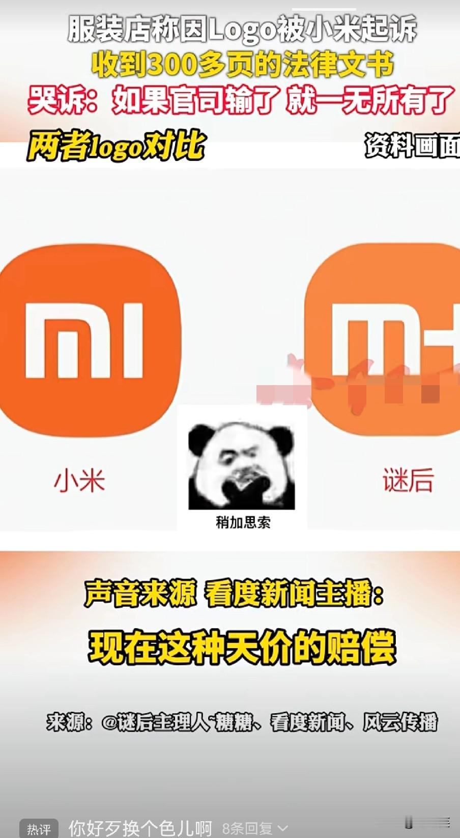 洛阳一服装店老板摊上事了 就因为店里logo和小米太像 被小米起诉,收到300多页法律文书 店主哭诉“要是官司输了我就一无所有了” 把两家logo放一起,都是橙色圆角矩形加白色字母,简直像双胞胎 不管生意大小,知识产权的边界都得守 你觉得这店主是该赔,还是情有可原