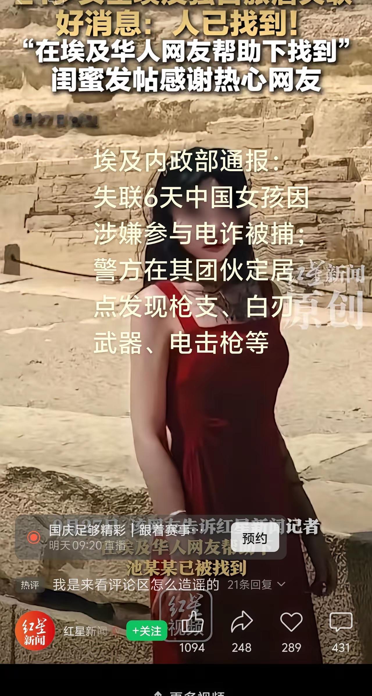 去埃及失联的女孩找到了,被捕了,还是电诈。红星新闻报道。[尬笑][尬笑][尬笑]