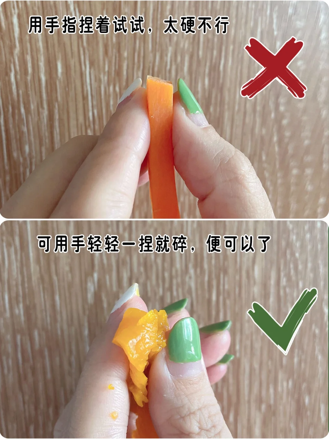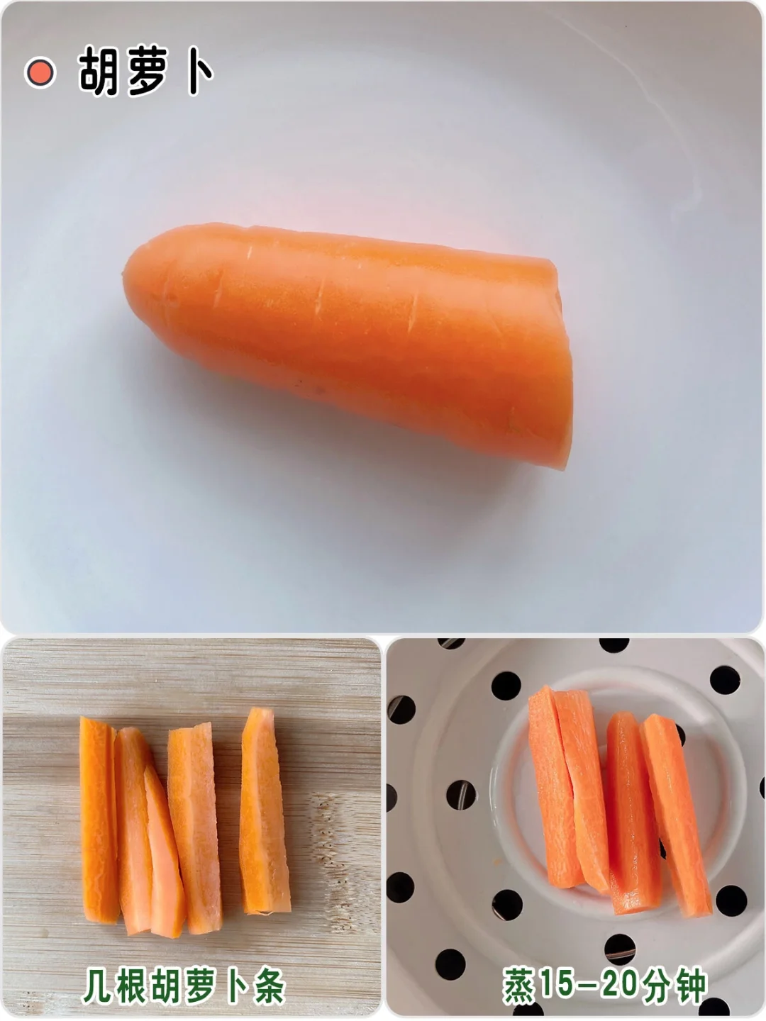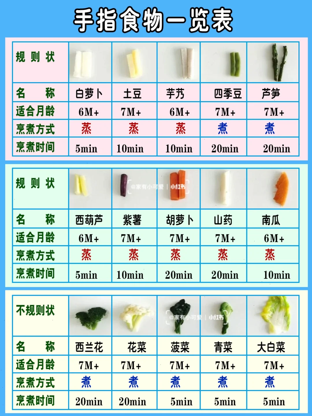 宝宝到了七八个月,就可以开始添加手指食物了。帮助锻炼咀嚼和吞咽,同时还可以锻炼宝宝的手部精细动作。蔬菜手指食物的吃法很简单,切条状或者块状,这样方便宝宝小手抓握。训练宝宝自主进食哦 . 🌈什么时候能尝试手指食物? 建议采取保守一些的方式,等宝宝能坐的很稳、有一定咀嚼能力,7-8个月左右比较好 . ❣️宝宝没牙能吃手指食物吗? 当然是可以的,宝宝即使没有出牙,小牙齿也已经在牙床里了,而且牙床咀嚼也是相当厉害的 . ✅如何引入手指食物❓ 把食物切成手指条的形状,处理到宝宝牙龈可以咬碎、大人轻轻一捏就碎的程度,也能避免有卡喉的风险. . 🍳初次添加手指食物该怎么选择呢? 建议把食物切成方便抓握得长条状,蔬菜选择软硬适中方便抓握的同时也好咀嚼。 👉一般刚开始可以尝试土豆 🥔紫薯 红薯 水果萝卜 黄瓜 西蓝花等等。食物完全蒸透,用叉子可以轻松插入,放到嘴里也能很轻松抿碎,这样能大程度减少卡喉的风险。这样能尝试过几次蔬菜条后可以给宝宝一些软软的小饼或者肉肠类。 . ✅适合7月龄+的蔬菜手指食物: ▪️白萝卜:切条,蒸5-10分钟左右 ▪️土豆:切条,蒸10分钟左右 ▪️芋头:切条,蒸10分钟左右 ▪️胡萝卜:切条,蒸15-20分钟 ▪️紫薯/红薯:切条,蒸10分钟左右即可 ▪️西葫芦:切条或者切块,蒸10分钟 ▪️山药:切条,蒸15分钟 ▪️芦笋:切条,蒸10分钟 ▪️南瓜:切条,蒸10分钟 ▪️西蓝花/花菜:焯水断生后,煮20分钟 ▪️茄子:切条,蒸15分钟 ▪️芹菜:切段,煮10分钟 ▪️青菜:煮5分钟 ▪️豆角:切段,焯水断生后,蒸20分钟 . ⚠️吃手指食物注意事项 ‼️给宝宝吃手指食物的时候家长一定要全程看护,以免发生意外。 ‼️添加手指食物的过程要循序渐进,宝宝如果不接受,可以放缓进程,一切按照宝宝自己的节奏来,宝妈不用太焦虑,每个宝宝都会学会的。 ‼️给宝宝手指食物并不要求宝宝能吃完,吃多少算多少,主要是锻炼宝宝抓握咀嚼以及自己吃饭的意识。