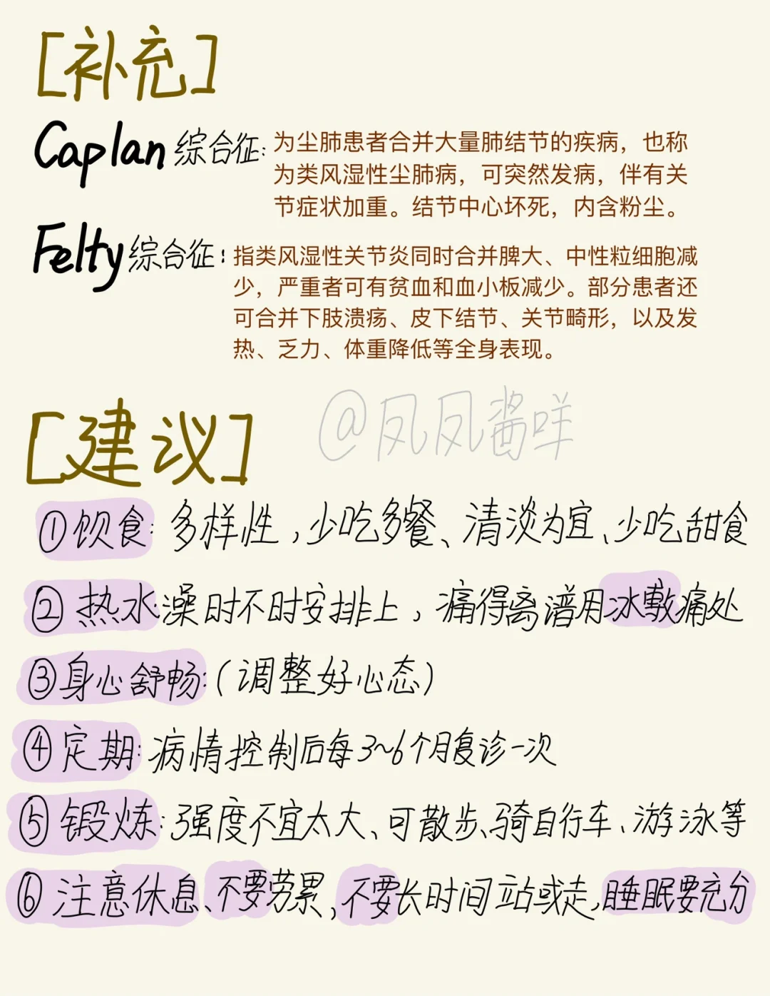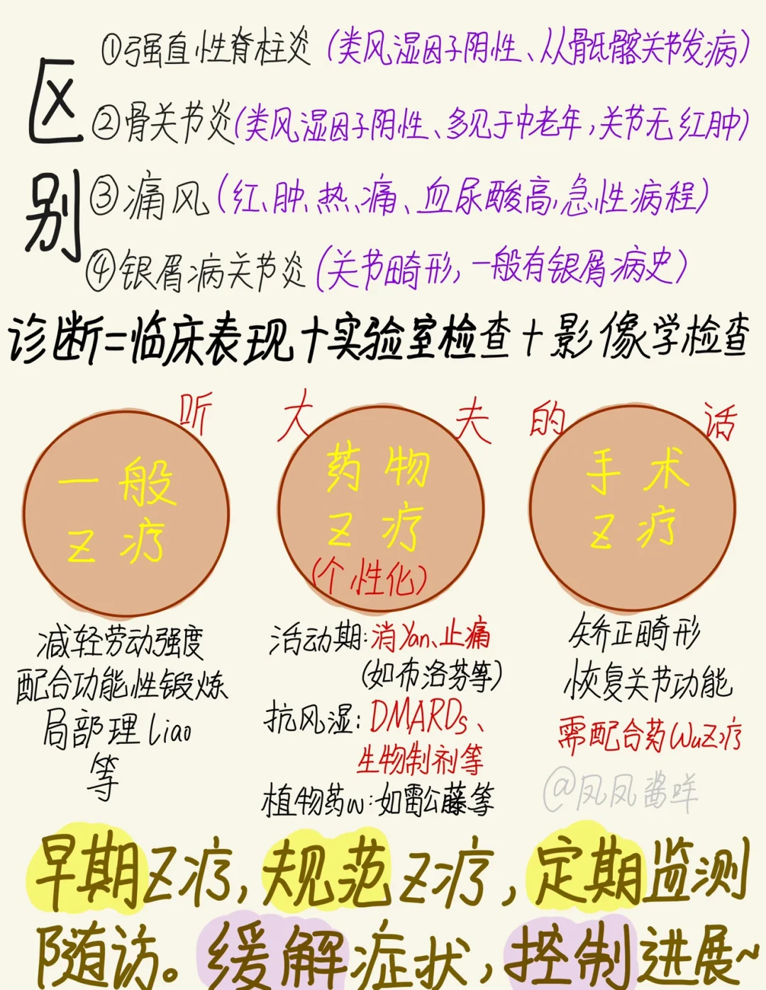 [向右R]类风湿关节炎一开始往往没有特别的症状,通常是从手腕,手指等小关节开始出现症状,逐渐变成对称的多个关节的慢性炎症(肿痛,关节腔积液,关节腔变小粘连,关节变形等),Zuni常见的还是“晨僵”(早晨起床后出现关节僵硬,开始活动后疼痛不舒服,活动一段时间又可以缓解)。如果有朋友出现晨僵的症状千万不要带掉以轻心,早去🏥检查是否有类风湿。