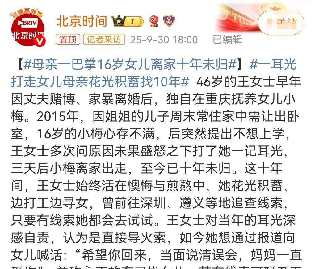 真的是太悲剧了。 9月30日看到这么一起悲剧。 一耳光打走女儿,母亲花光积蓄找10年。 16岁就离家出走了。 没想到10年没有回来。 这真的是太记仇了。 虽说被打了一耳光,可毕竟是母亲,这么多年的养育之恩。 希望这个女儿看到这个消息,能够尽快联系自己的母亲。