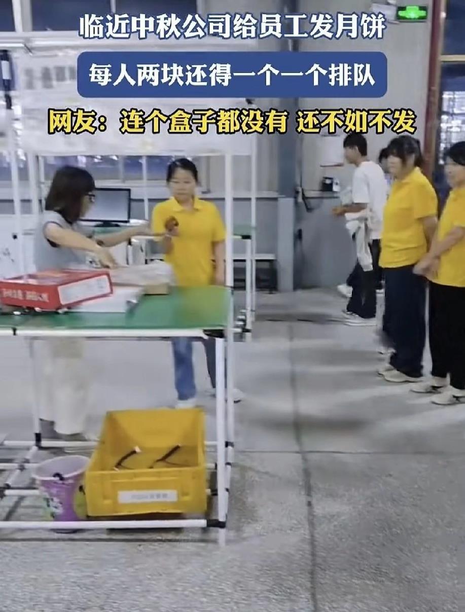 山东一家公司临近中秋,在车间给工人们发月饼,每人仅发两块,而且还得一个一个排队领