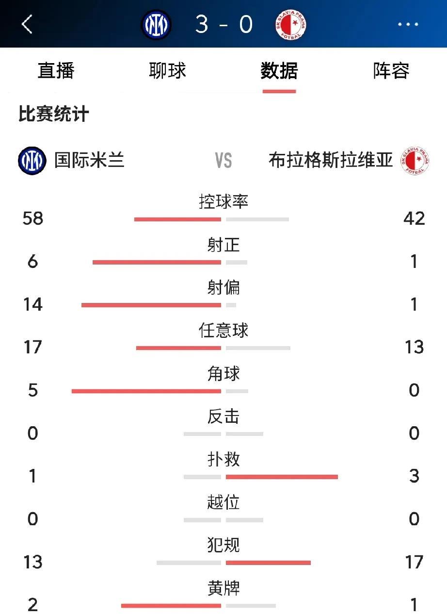 齐沃带队渐入佳境,欧冠又是一场碾压式胜利,主场3-0拿下弱旅布拉格斯拉维亚。 1.防守几乎没有给对方任何机会,射门统计20-2,射正6-1,控球58%-42%。 4. 球员体能越来越出色,几大体能困难户巴斯托尼,迪马尔科,恰尔汗奥卢都打满全场,尤其是恰尔汉奥卢已经连续首发打满全场,这在上赛季很少有的。 欧冠+联赛4连胜真是美妙至极,加油啊,国米!