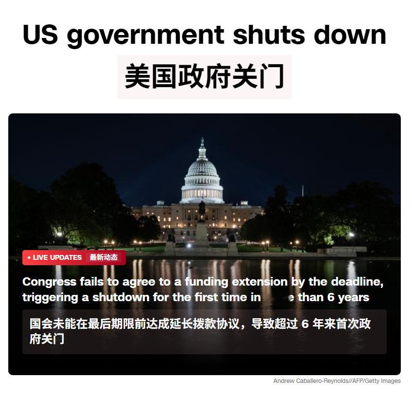 当地时间10月1日0时,在最后期限内因美国国会未能通过维持运转的拨款案,美国政府资金耗尽而停摆,这也是美国政府时隔超过6年再次关门。美国数十万联邦雇员将被迫无薪休假,部分公共服务或暂停。