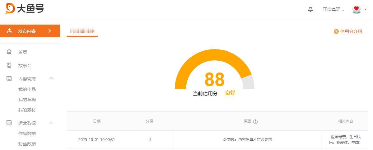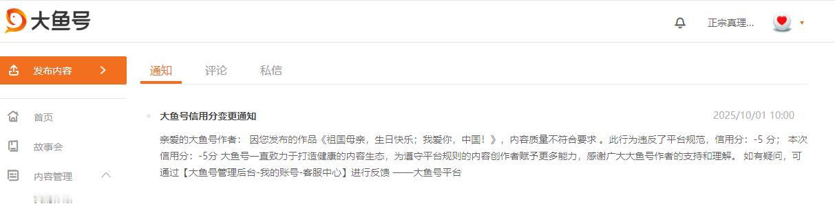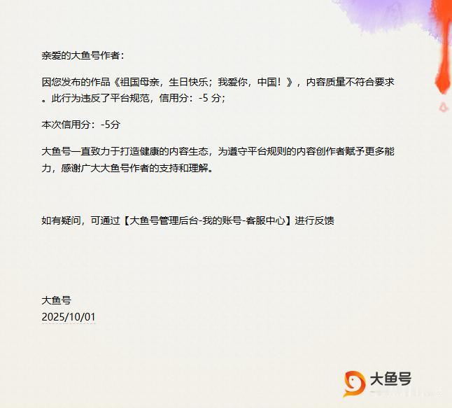 宣布永久退出“大鱼号”,祝祖国生日快乐被处罚。 10月1日,是伟大的中华人民共和