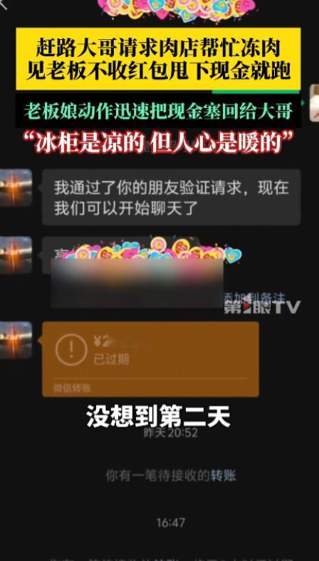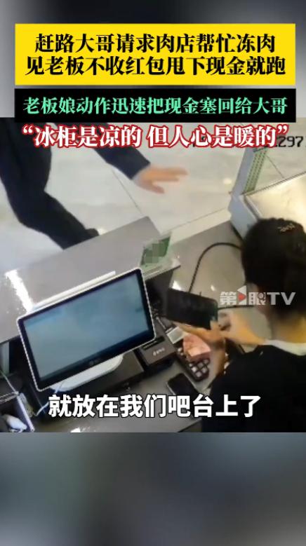 “活该他发财!”9月27日,内蒙古乌海,一游客晚上路过当地,担心车上的羊肉化冻,就让肉店老板帮忙冻一下,第二天早上再来取。为了表达感谢,游客给老板发了200元的红包,见对方一直不收,第二天取肉时甩下现金就跑,结果还是被老板追上把钱还了回去。 一名经过的游客,焦急地走进了店里,带着一包羊肉,显得有些不安,原来他和家人正在赶路,车里的羊肉担心会在夜间化冻,影响第二天的行程,于是他决定找个地方暂时存放这些羊肉,等第二天继续赶路时再取回来。 店主是对面摊位的肉店老板,正在忙着准备关店,见到游客的请求后,他立马表示可以帮忙,虽然店里的冰箱已经没有空余空间了,但他并没有犹豫,马上去后面腾出了一点地方,把羊肉放了进去,虽然只是一件小事,但他并没有觉得麻烦,反而觉得自己能帮上一把很高兴。 男子在临走时,显得有些不好意思,他知道这事儿可能打扰了老板,但还是拿出了200元钱,作为感谢,转到了老板的账户上,但老板却没有收下,男子有些无奈,觉得自己表示感谢的方式太少,于是他决定第二天早晨来取肉时再把钱交给老板。 到了第二天清晨,男子如约来到了肉店,手里拿着那笔准备好的现金,见到老板准备好迎接他,他将200元放在了店里的前台,便匆匆跑了,老板一看,立马意识到这钱是游客的心意,便让妻子赶紧去追上他把钱送还给他。 老板的妻子追出了几步,才终于找到了那位游客,赶紧把钱还给他,男子见状十分感谢,但也没想到老板这么坚持,把钱还了回去,只好连连道谢,一边说着“谢谢”,一边有些不知所措。 这件小事看似简单,却充满了温情,老板的举动,不仅是出于对他人的帮助,更是一种温暖人心的善意。 这件事,也让人想起了当今社会里,人与人之间的真诚和帮助往往被忽视,我们习惯了繁忙的生活,忽略了那些能够温暖心灵的小细节,正是这些看似微不足道的善意,往往能在关键时刻化解困境,让人感受到社会的温暖和正能量。 在这个快节奏的时代,人与人之间的信任和帮助变得越来越难能可贵,就像那位肉店老板一样,在他眼里,帮助别人并不需要什么回报。 反倒是那名游客,自己心中也满是感激,毕竟大家都是生活在同一个社会中,帮助别人,自己也会变得更加充实。 就算是普通的肉店老板,也能因为一次简单的帮助,让陌生人感受到温暖,这种互帮互助的精神,才是让这个社会更加和谐的重要力量,而那200元,也许并不是游客最看重的东西,更多的是他感受到的一份责任和温情。 虽然这只是一个普通的事件,但它反映出的是人性中的美好,在这个冷漠的世界里,能遇到像肉店老板这样的人,实属难得。 在大多数时候,我们都在追求着自己的生活,忙着工作、学习和其他琐事,可能很难有机会去帮助他人。 然而有时候,一个简单的举动,却能给他人带来巨大的温暖和改变,这也是我们每个人都应该保持的美好品质。 人与人之间的信任和帮助,常常不会因为短期的得失而改变,无论是送肉入冰箱的小小举动,还是坚决不收红包的坚持,都是善意和诚意的体现。 这种温暖的力量,或许比任何回报都要珍贵,这种精神,也许能成为我们每个人在生活中追求的目标之一。 对于这件事情,大家有什么看法? 信息来源:《冰柜是凉的,但人心是暖的!肉店帮赶路大哥冻肉并塞回感谢费 ,老板娘:他发红包我们没要,没想到第二天他带着现金放在我们吧台就走了,我赶紧把钱塞了回去!我相信乌海任何一家店,都会帮这个忙的。》第1眼新闻