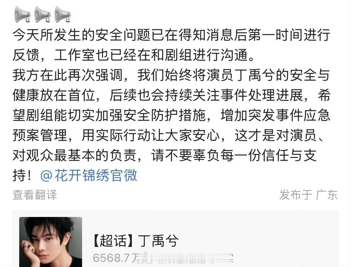 丁禹兮的马受惊失控丁禹兮对接回应称始终将演员丁禹兮的安全与健康放在首位,后续也会