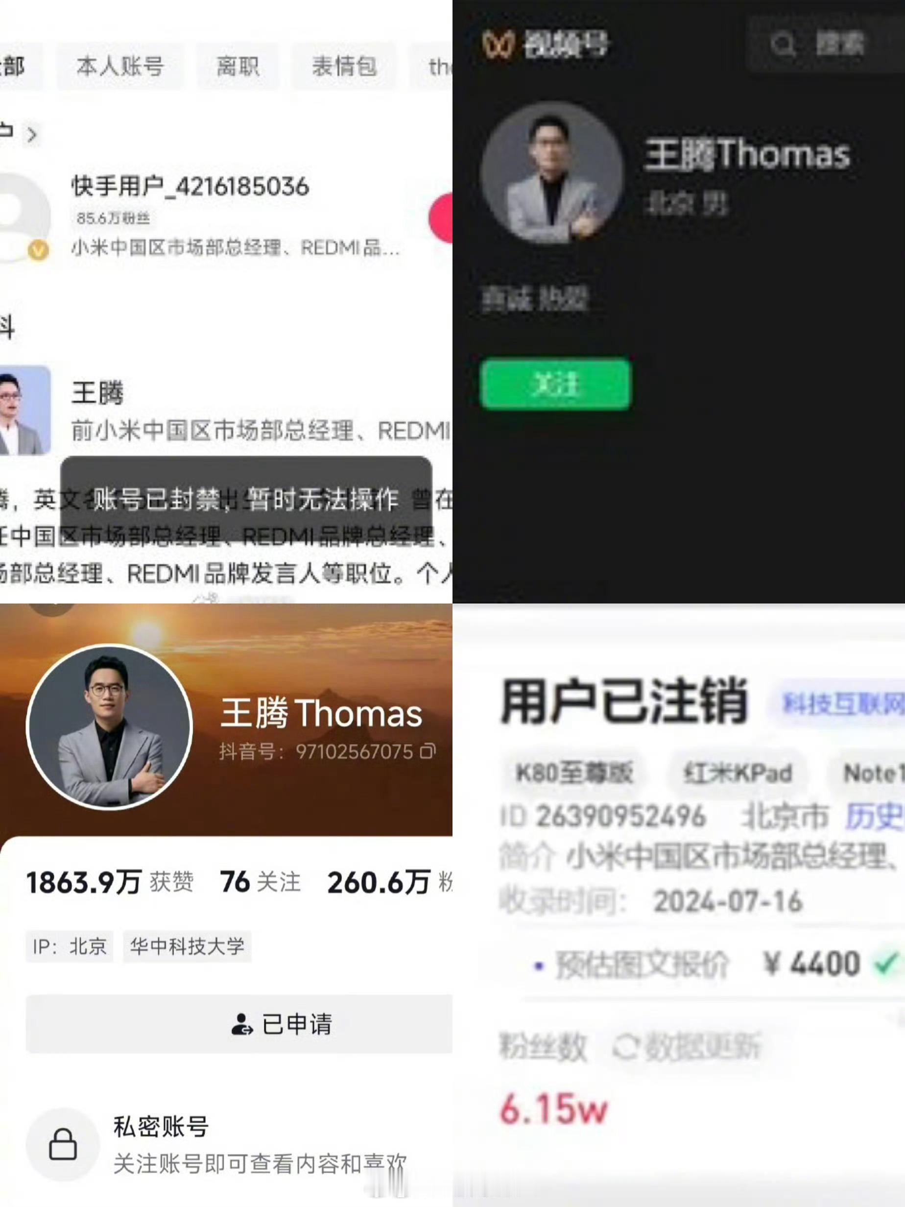 王腾被小米辞退后多平台账号变动:小红书注销、快手被封禁、抖音已私密、视频号清空内容[思考]