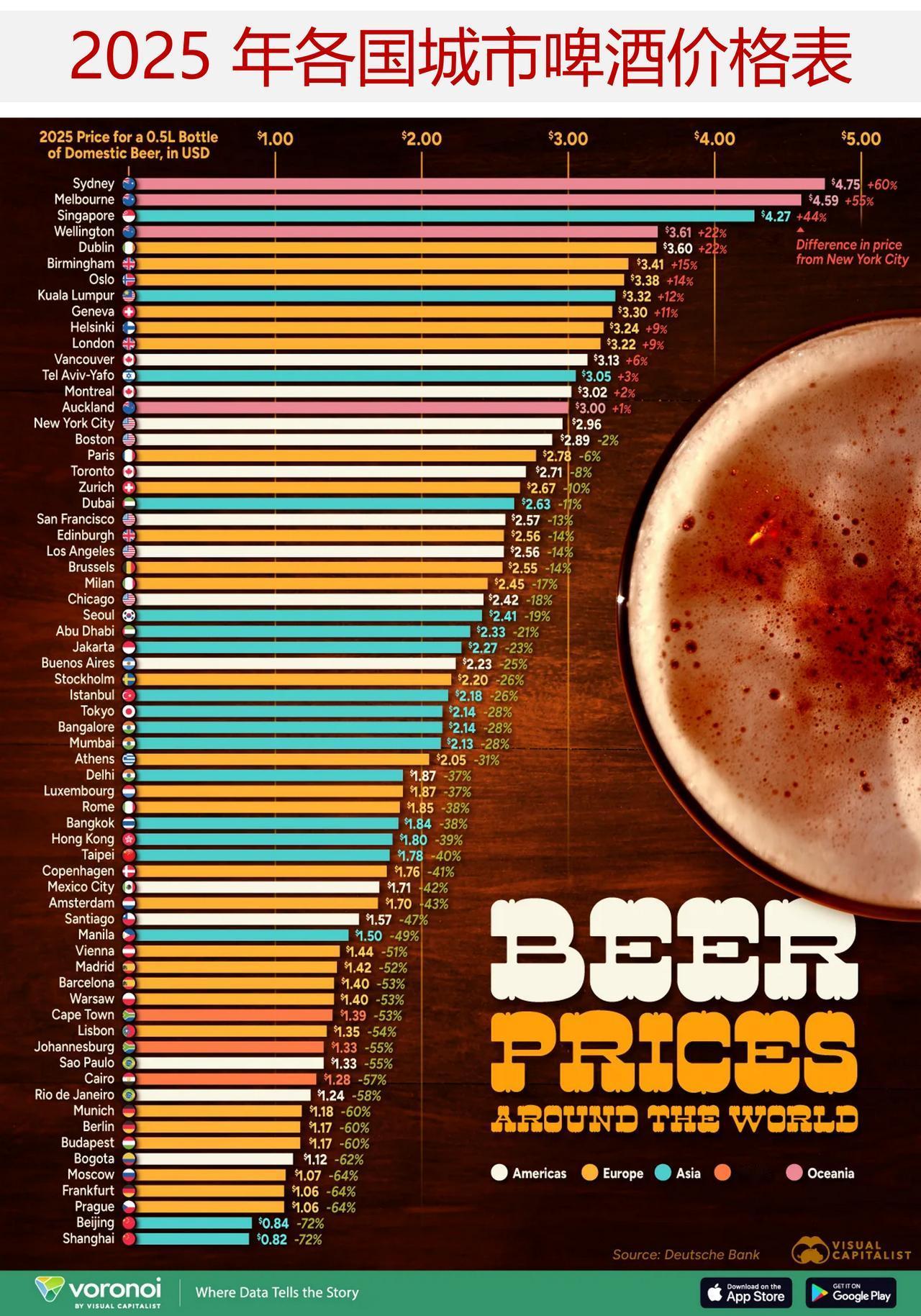 世界上哪里的啤酒最贵?来看2025 年各国城市啤酒价格表 从莫德罗啤酒到嘉士伯啤酒,过去五年间,全球范围内的啤酒价格大幅上涨。 虽然通货膨胀是一个重要因素,但税费往往在最终价格中占据了较大的比例。如今,在上海一瓶酒的价格可能低至 0.82 美元,而在悉尼则可能高达 4.75 美元。 这张图表展示了根据德意志银行的数据,展示了 2025 年全球 67 个城市中一瓶0.5 升装国产啤酒的平均。 在澳大利亚,啤酒价格因高额税收而上涨,其价格甚至比纽约市高出至少 76%。 此外,新加坡(排名第 3)的排名也相当靠前,其税收因素也起到了一定作用,这反映了政府推行的旨在阻止居民饮酒的举措。在邻近的马来西亚,吉隆坡一瓶啤酒的平均价格为 3.32 美元——比纽约高出约 30%。 在欧洲各地,这种差距十分明显:爱尔兰的啤酒价格最为昂贵,一瓶售价 3.33 美元;而布拉格(这里是全球啤酒消费量最高的地方)的啤酒价格则最低,仅为 1.06 美元。