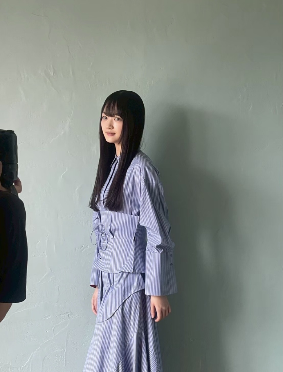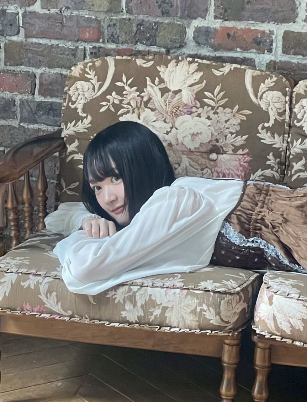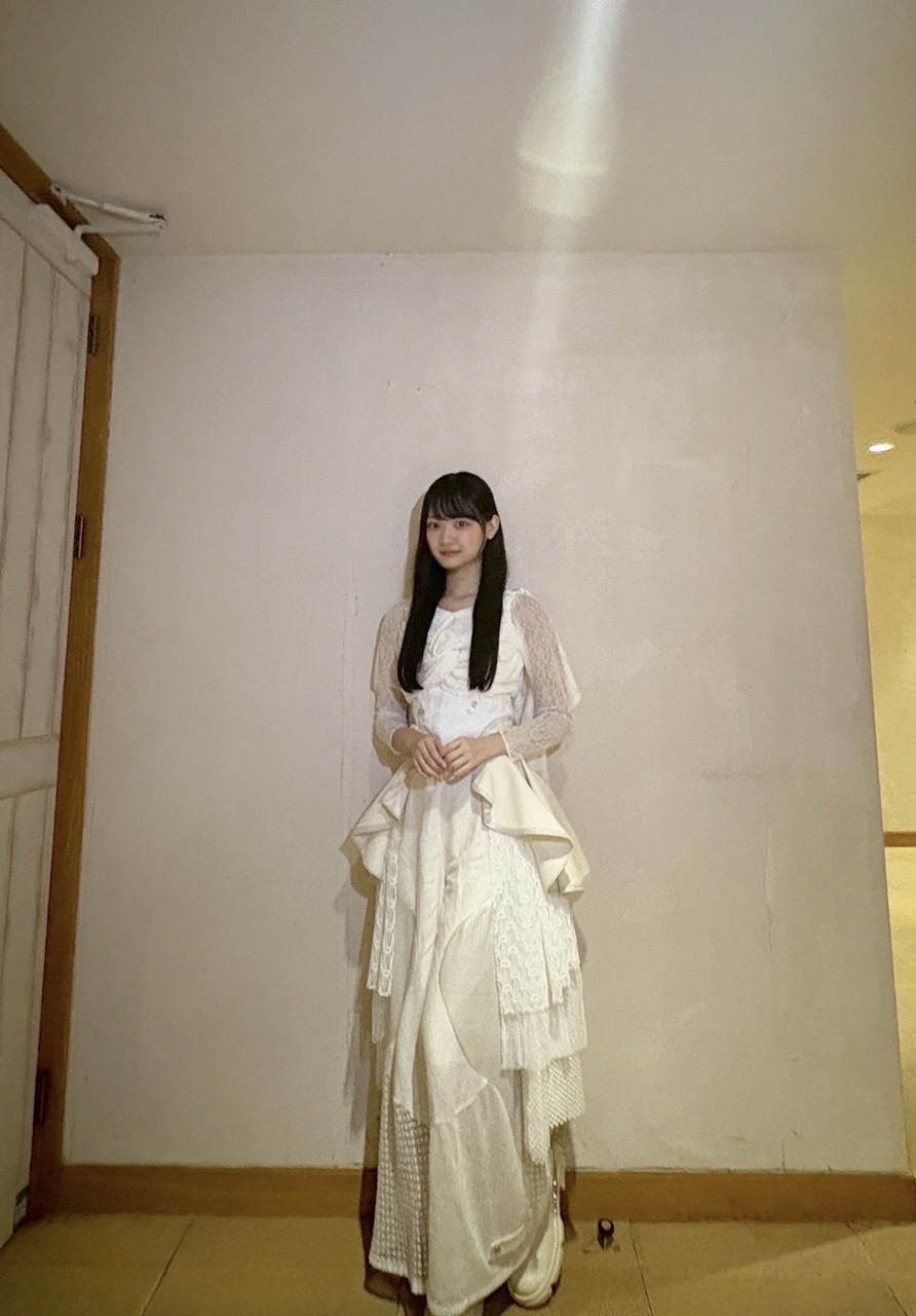 目黒陽色「2人でずーっとこのロッキングチェアに乗ってゆらゆら揺れてたよ〜☁️わこさんはいつかこの椅子のあるおうちでゆっくりと過ごしてみたいそう🤍柄の違うレースがいくつも重なっていて繊細なつくりのドレスのようなとってもすてきな衣装✨」