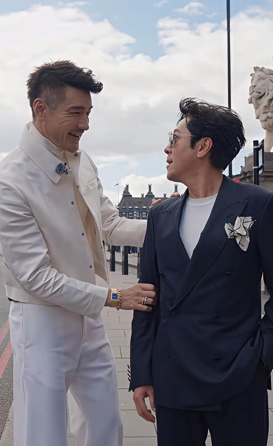 蔡国庆和胡兵,这两个人站在一起,真够吸引眼球的! 背景应该是国外的某个城市,他俩站一条大河的桥上,一高一矮,一个戴眼镜,一个不戴眼镜,一个穿浅色套装,一个穿深色套,两个人形成鲜明对比,真够拉风的! 蔡国庆无论正面看还是侧面看,都颜值在线不显老,而胡兵就不同了,正面看像三十多岁的小伙,侧面看到他的眼角,一下子暴露了真实年龄! 这个蔡国庆,现在跟胡兵走的这么近,也想当男模吗?是不是当评委老师很枯燥,不想当评委老师了? [微风]