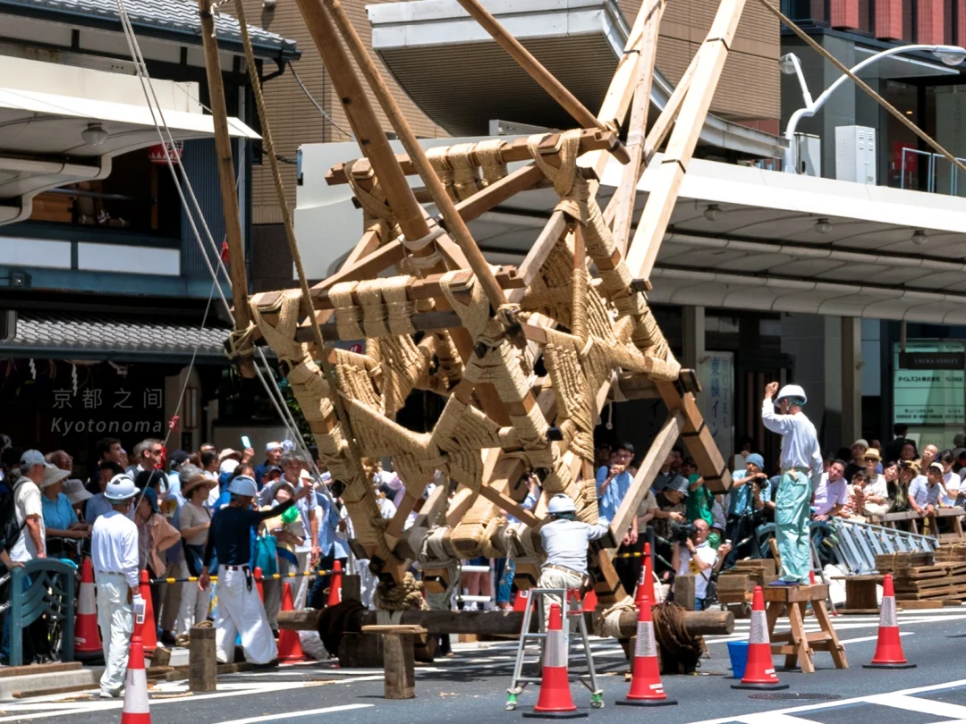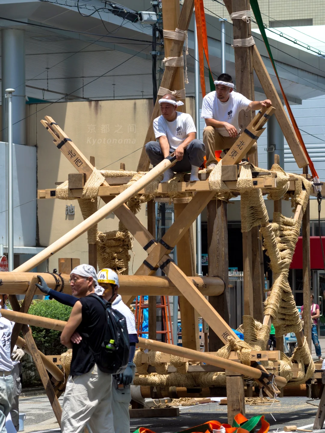 ◎山鉾的搭建方法代代相传,从一堆散料的工地到一座座移动的美术馆,只用短短一到三天!