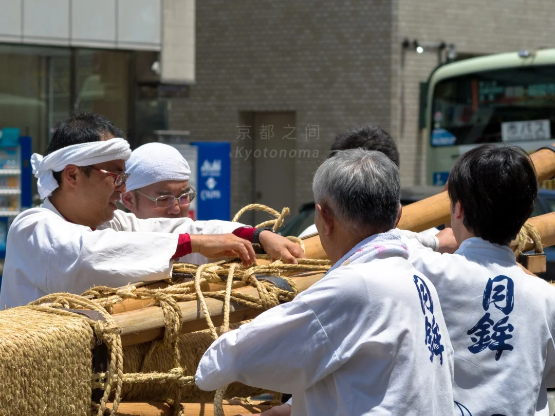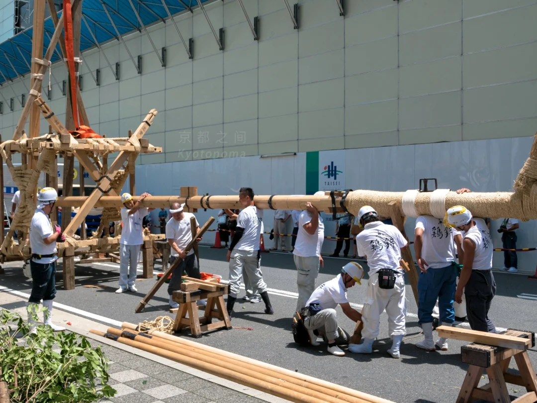◎山鉾的搭建现场就在马路上,完全展示在行人面前,无论是谁都可以看到部件和搭建过程😉