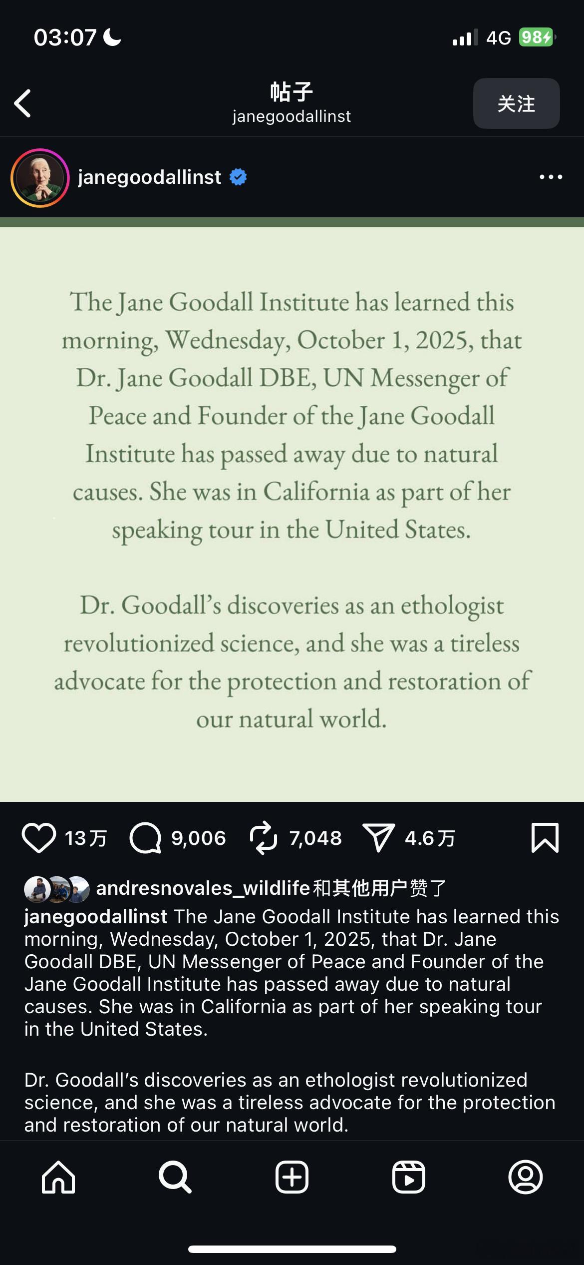 上帝保佑你,晚安,珍·古道尔博士🙏🏻