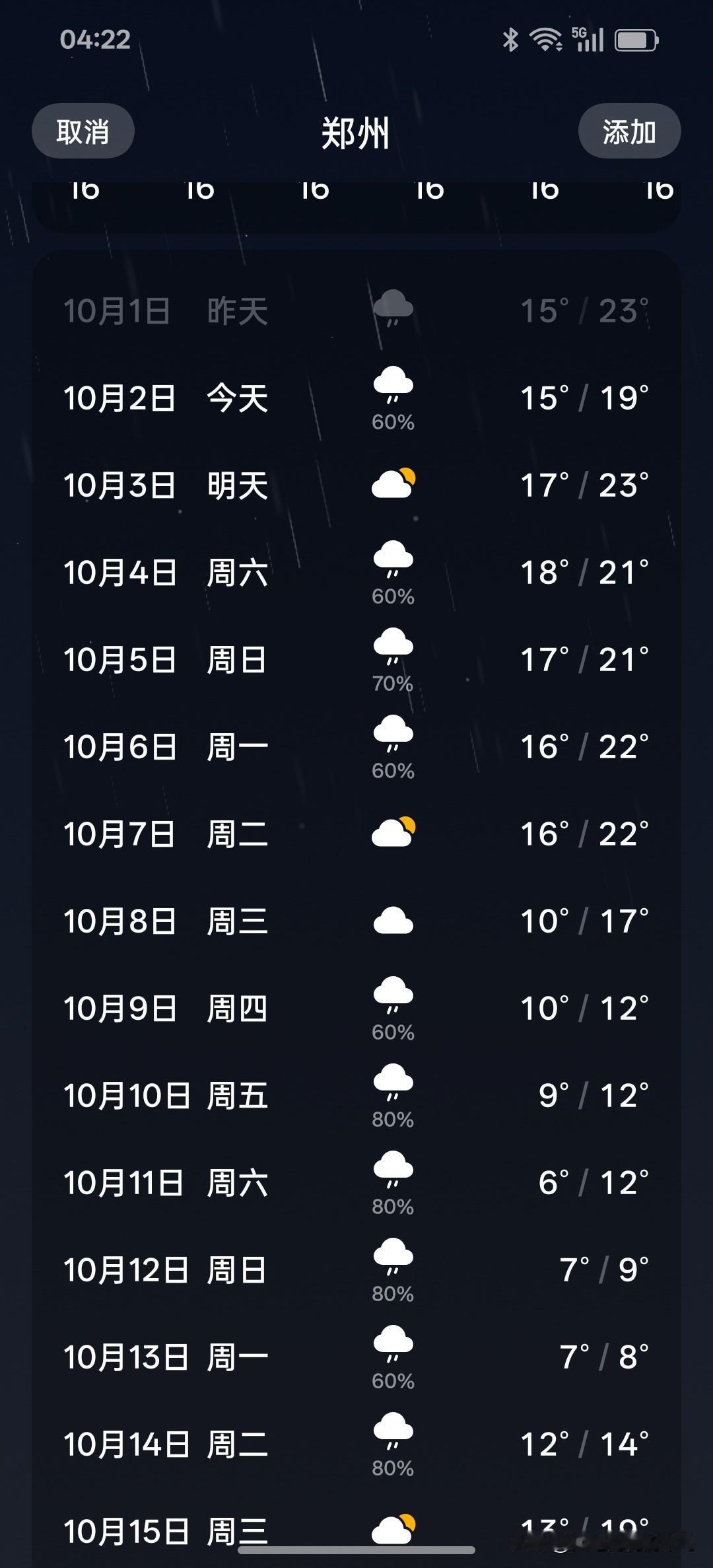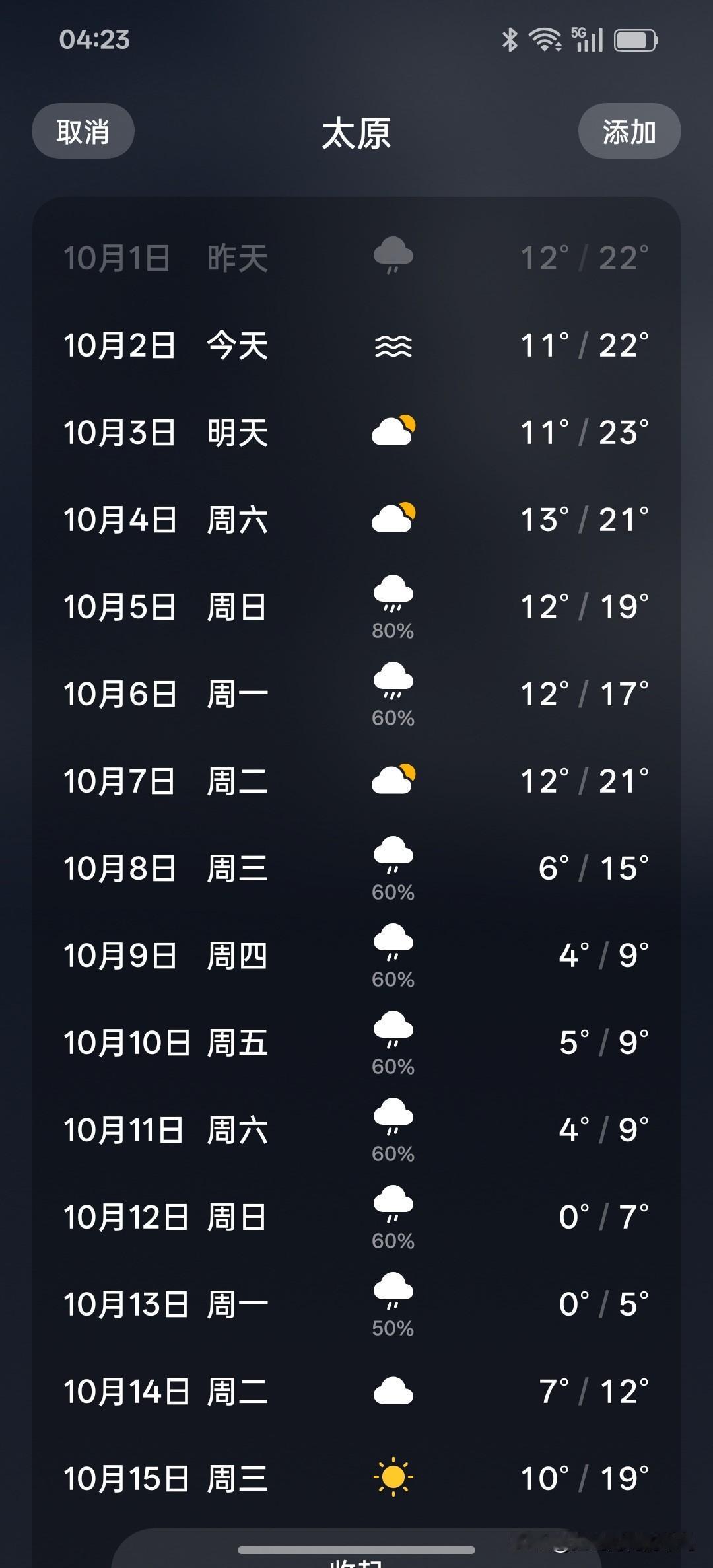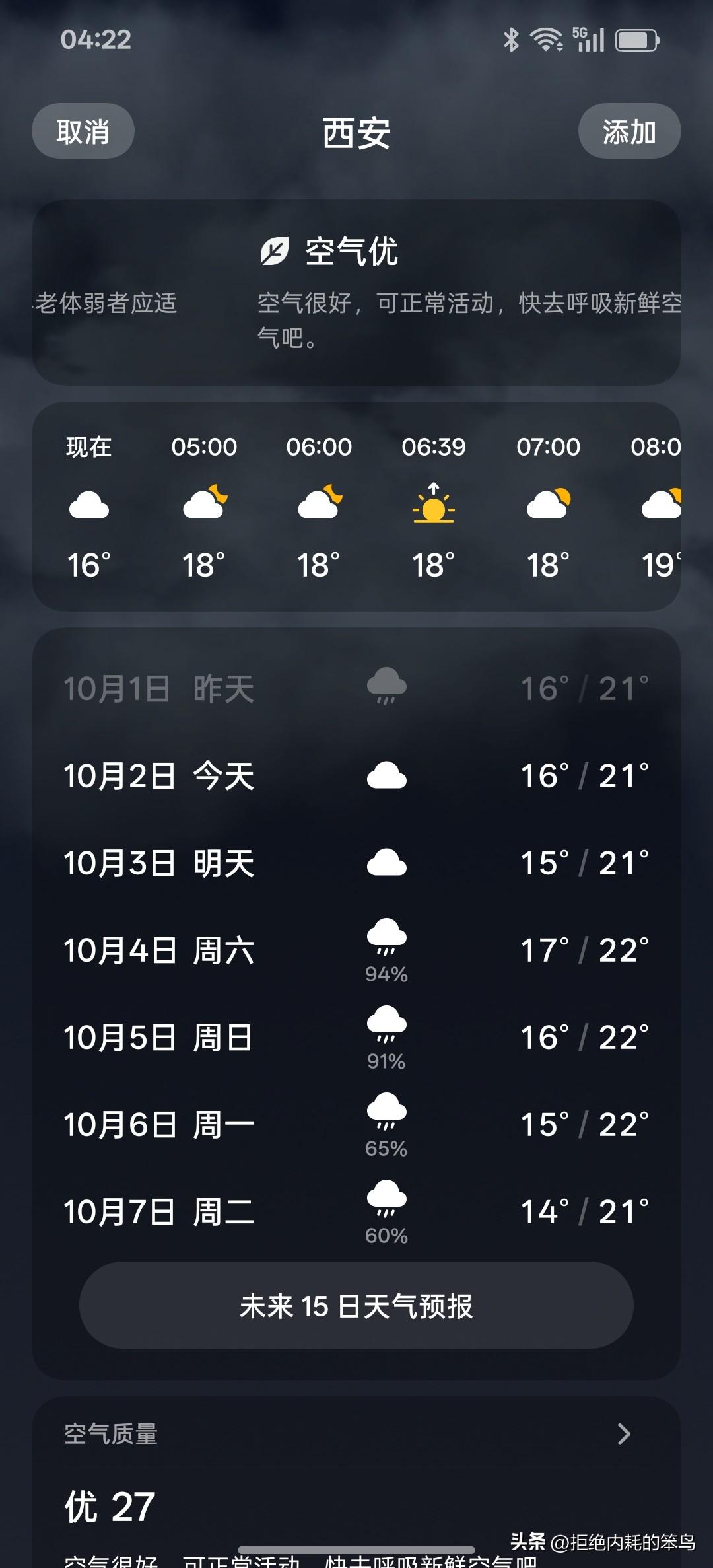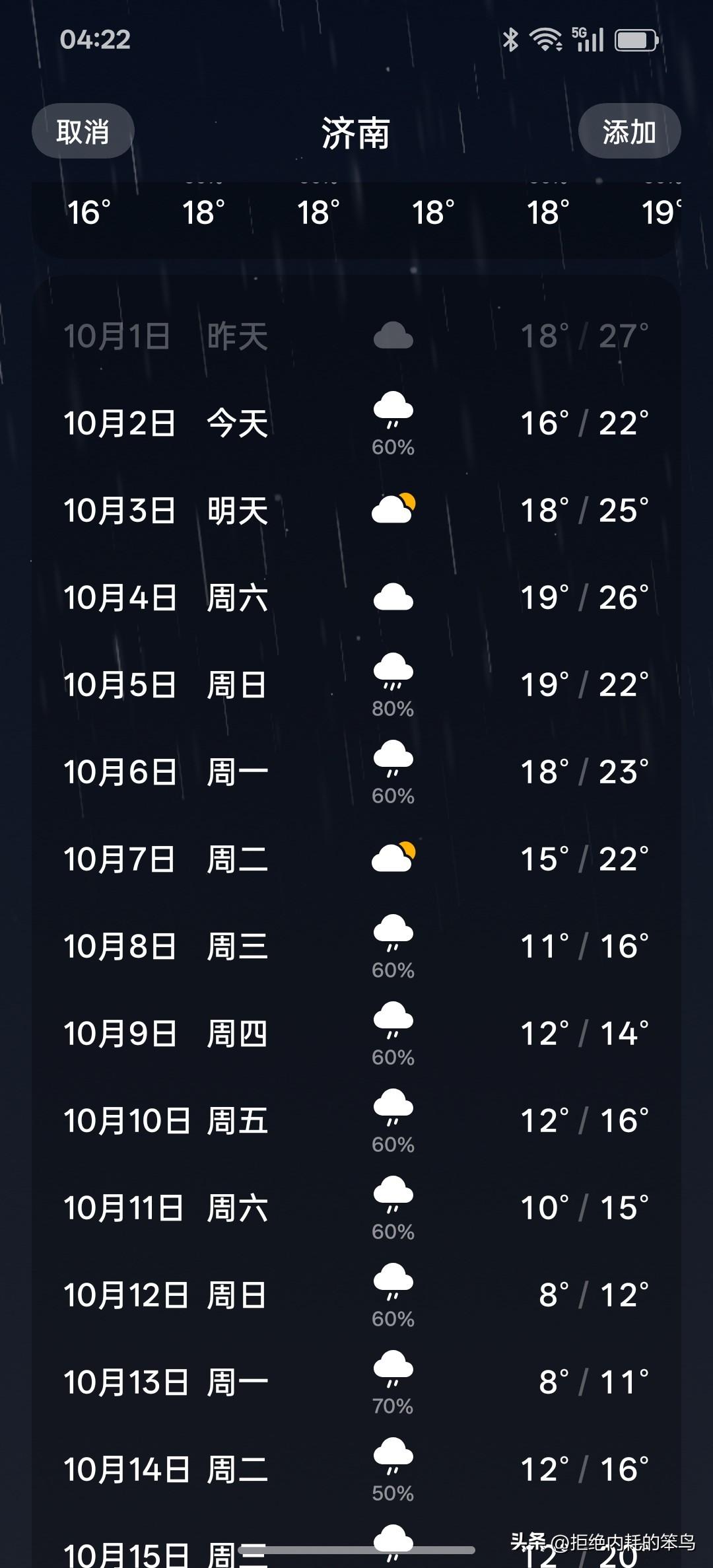 天漏了,漏在山河四省的头上,并捎带了陕西! 假期第一天,是我术后康复的第一天,白天睡的太多,晚上睡不着,一个是疼痛,整个左手麻麻的;另一个是心烦,原本可以助眠的下雨声成为提神剂。 过犹不及。特别是秋雨,9月份已经下了快半个月,看天气预报10月份至少还有半个月。雨有大有小,但持续不断,让人心烦。 自从北斗联网后,天气预报已经很准,说下雨不会晴天。看了假期的全国天气预报,查询了重点城市,发现了这次降水的几个特点: 1.湖北是降水的分界线。武汉下一天后转阴放晴,气温在30度以上。 2.最不需要雨水的山河四省最为集中,还捎带了陕西。越是在秋收的关键期,花生🥜,玉米🌽,等收上来难,晾晒不干,就会发芽🌱霉变,秋季是经济作物,是农民收入的主要来源,让人咋国? 3.密集降雨伴随着温度大幅下降。到后半段气温直接干到个位数,太原最低到0度,还有个别地方下起了冻雨。 活了几十年,我不记得哪年10月份到过这么低的温度! 全国大降温 陕西下冻雨 河南降雨要下多久 你觉得山东降雨会持续多久 山西降温