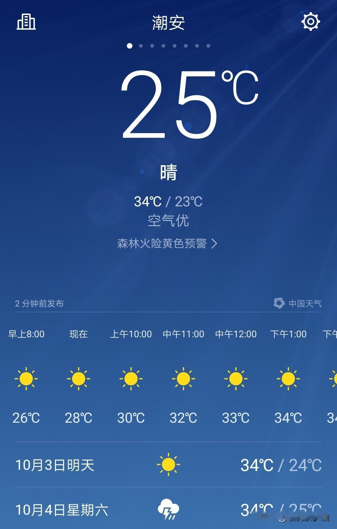 21号台风麦德姆即将生成! 国庆中秋假期前期广东晴热为主, 10月2~4日白天, 我省大部晴到多云; 4日夜间~5日夜间, 热带气旋给我省珠江口以西沿海市县和海面带来风雨影响; 6~8日, 我省大部多云, 部分市县有(雷)阵雨。 今天(2日), 潮州喜提一个多云转晴天气, 气温23~34℃, 此刻气温25℃。 森林火险黄色预警信息正在生效中…… 看看今天的天空, 阳光如此耀眼, 全天最高气温高达34℃, 外出游玩的小伙伴们, 需要注意做好防晒措施, 记得多喝水, 多喝热水! 国庆假期的第二天, 天气晴好, 赶紧带上家人们, 浪起来吧! 今天的天气, 要给好评哟~ 如此天气! 元芳,你怎么看?
