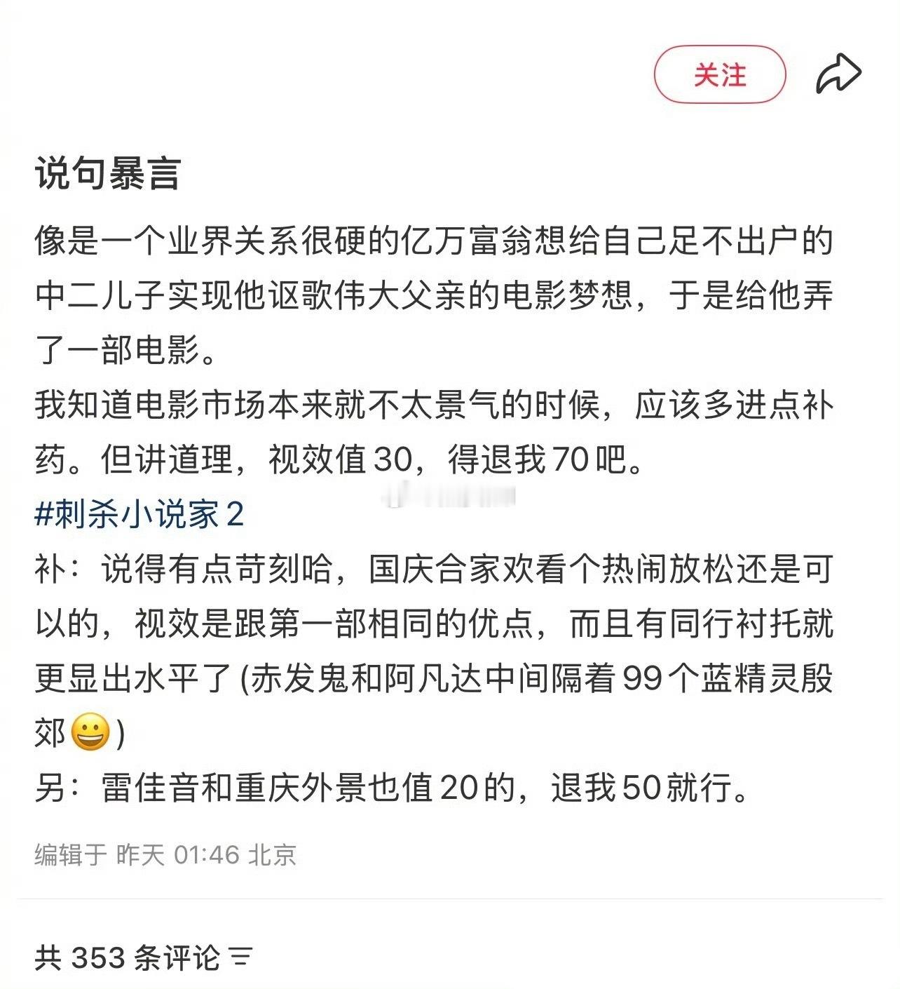 刺杀小说家2你们看了没,咋口碑那么差,看观后感一面倒的差评,我本来还准备去看来着。 ​​​