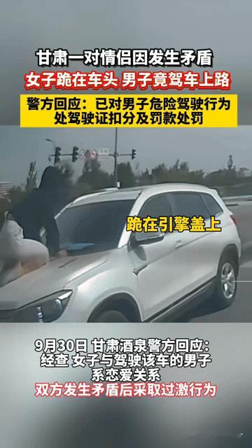 甘肃街头惊心一幕:情侣矛盾升级,女子跪车头被驾车带走,网友:太离谱! 你能想象吗?甘肃街头竟出现如此危险的一幕!一对情侣因矛盾激化,女子跪在车头引擎盖上,男子却直接驾车上路,在马路上肆意行驶,这惊险画面让目击者捏了把冷汗。 据了解,两人是恋爱关系,矛盾爆发后采取了极端过激行为。最终,警方对男子的危险驾驶行为作出驾驶证扣分及罚款的处罚,当地派出所也介入对二人的矛盾进行调解。 恋爱中的摩擦本可通过沟通解决,可这般拿生命和交通法规当儿戏的操作,实在荒唐又危险。这也警示所有人,再大的情绪,也不能逾越安全与法律的红线!