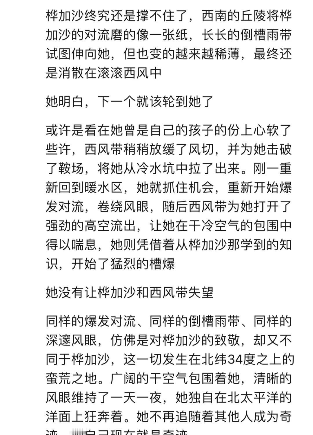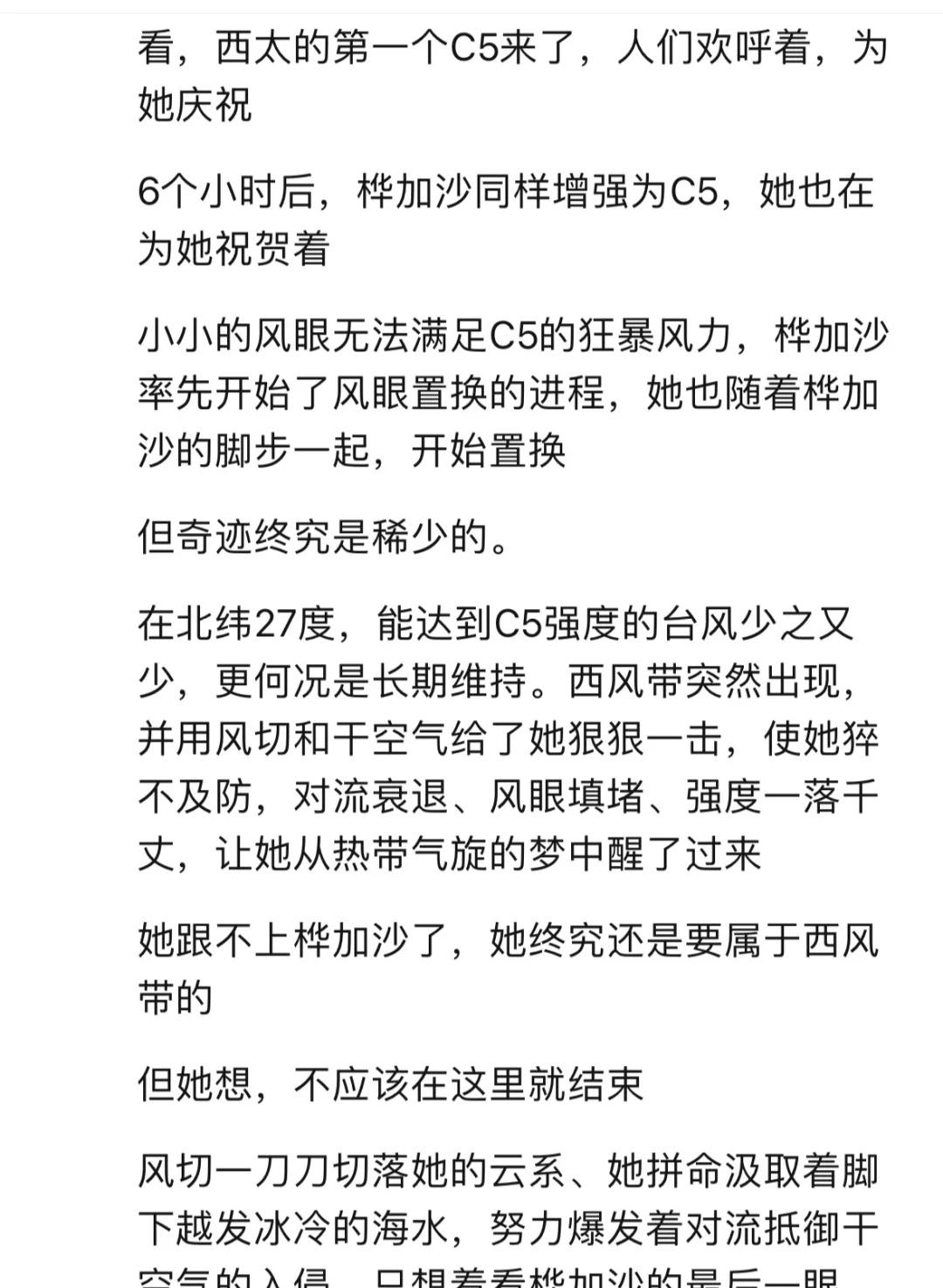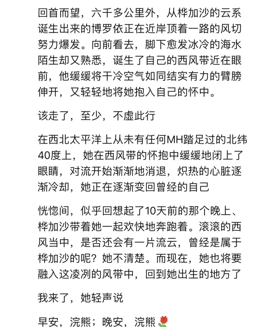 致敬传奇台风浣熊 来自西风带,一个不起眼的冷涡 西太平洋今年第一个超强台风 北纬27度的C5飓风 和桦加沙形成双超台共舞的壮丽画面 而后藏匿于桦加沙的光芒之下,逐渐被人遗忘 它就像一个顽皮的i人孩子,在太平洋上的无人区独自打转 当人们再次发现它时,桦加沙早已消散,连后来的博罗依都已经走入了生命的末端 小浣熊居然又加强为强台风,展现了生命的不可预测性,创造了西太平洋最高纬度的奇迹,北纬37度的C4,历史唯一 来自西风,归于西风,期待下一次再见 很喜欢贴吧里的一个回复,放在P5-P9
