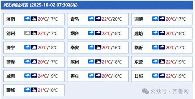 2日白天到夜间,全省天气阴,枣庄、临沂、日照、潍坊南部和青岛有中到大雨局部暴雨并伴有雷电,其他地区有小雨局部中雨。东北风,临沂、日照和南部沿海地区5~6级阵风7~8级,其他地区3~4级,雷雨地区雷雨时阵风7~9级。夜间最低气温:鲁中山区15°C左右,其他地区17°C左右。最高气温:鲁中山区和半岛内陆地区18°C左右,其他地区21°C左右。