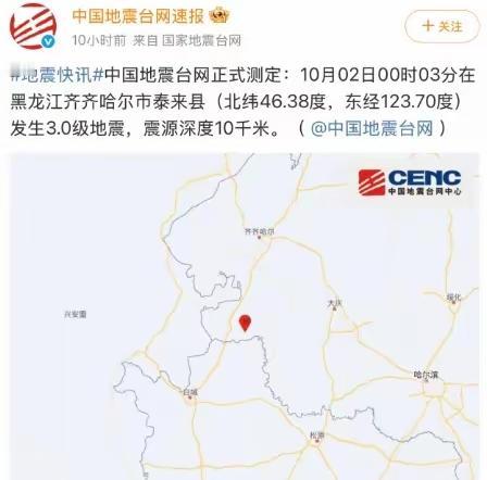 10月2日多地“微震动”,3.0级以上地震连番报到 10月2日,地球“小动作”有点多。黑龙江齐齐哈尔、甘肃张掖、新疆阿克苏、江苏盐城大丰海域,四地先后被3.0级以上地震“点名”。 最早“敲门”的是黑龙江泰来县,0时03分先来个3.0级。甘肃肃南县最活跃,0时31分3.3级、7时58分3.2级连震两次。新疆库车市5时00分震3.2级,江苏大丰海域8时27分以3.4级收尾。 这些地震像“轻轻拍窗”,震级不大,却也在提醒大家:留意环境变化,安全弦别松。