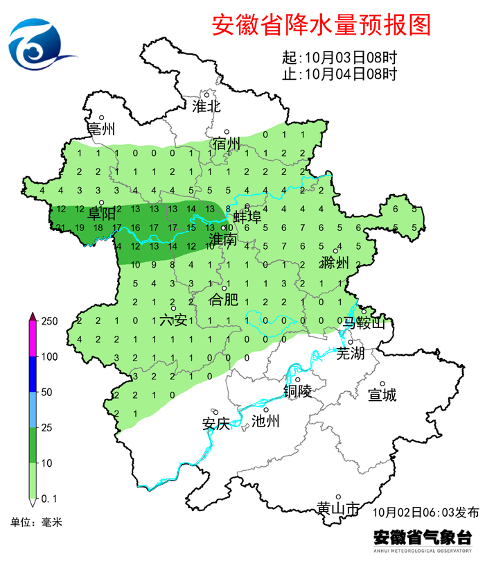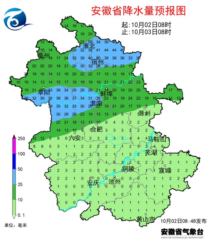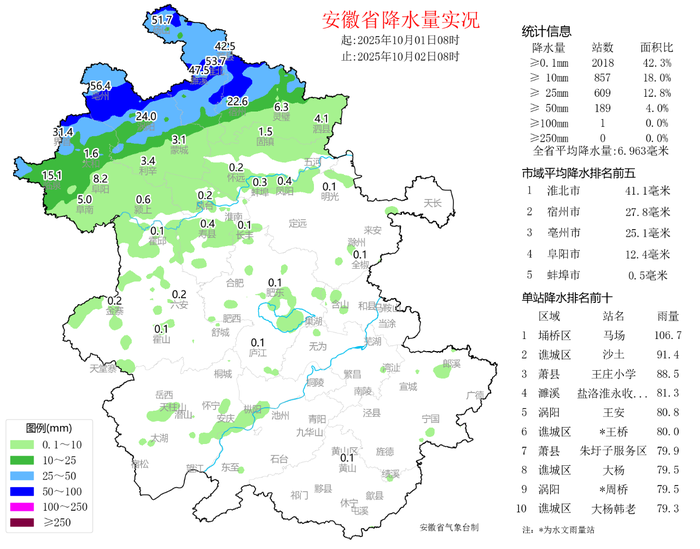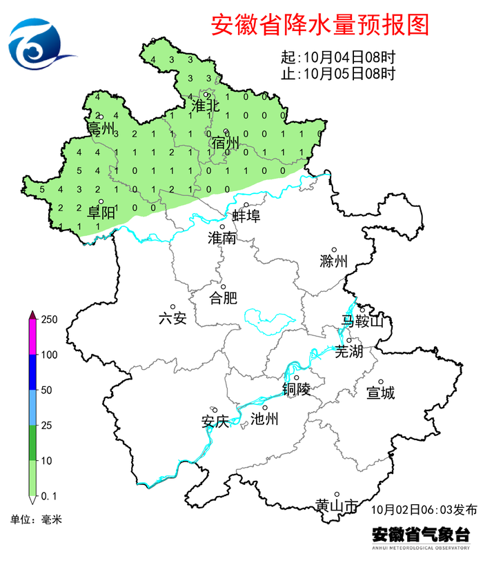 昨天沿淮淮河以北出现阵雨或雷雨,其中阜阳北部、亳州和宿州中到大雨,有188个站暴雨,最大宿州埇桥区马场106.7毫米,小时最大雨强65.8毫米/小时(2日08时)。