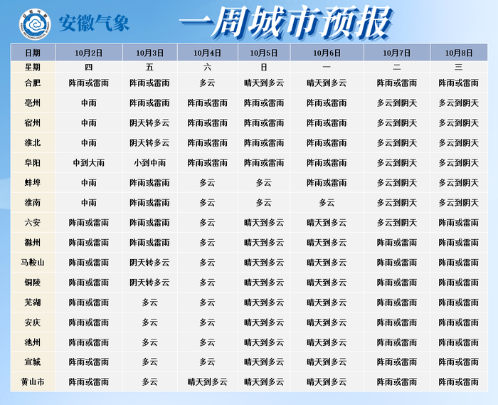 2日(周四):全省阴天,大部分地区有阵雨或雷雨,其中淮河以北和江淮之间北部中到大雨,局部暴雨。