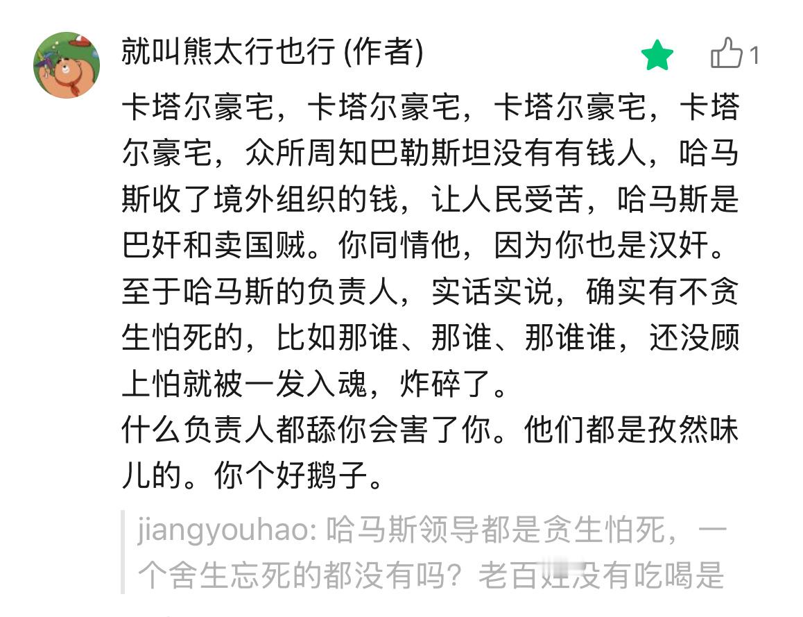 你得说“哈马斯领导人拿外国人钱”“哈马斯领导人买豪宅”“哈马斯领导人让群众吃糠咽菜”“哈马斯领导人是巴奸”,对他们才有杀伤力。