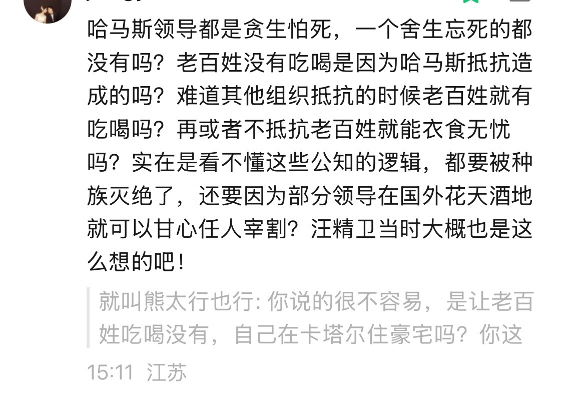 遇到三低读者,你跟他说“哈马斯是恐怖主义者”是没用的,因为他们本身也是恐怖主义者,哈马斯越暴力他们就越兴奋。
