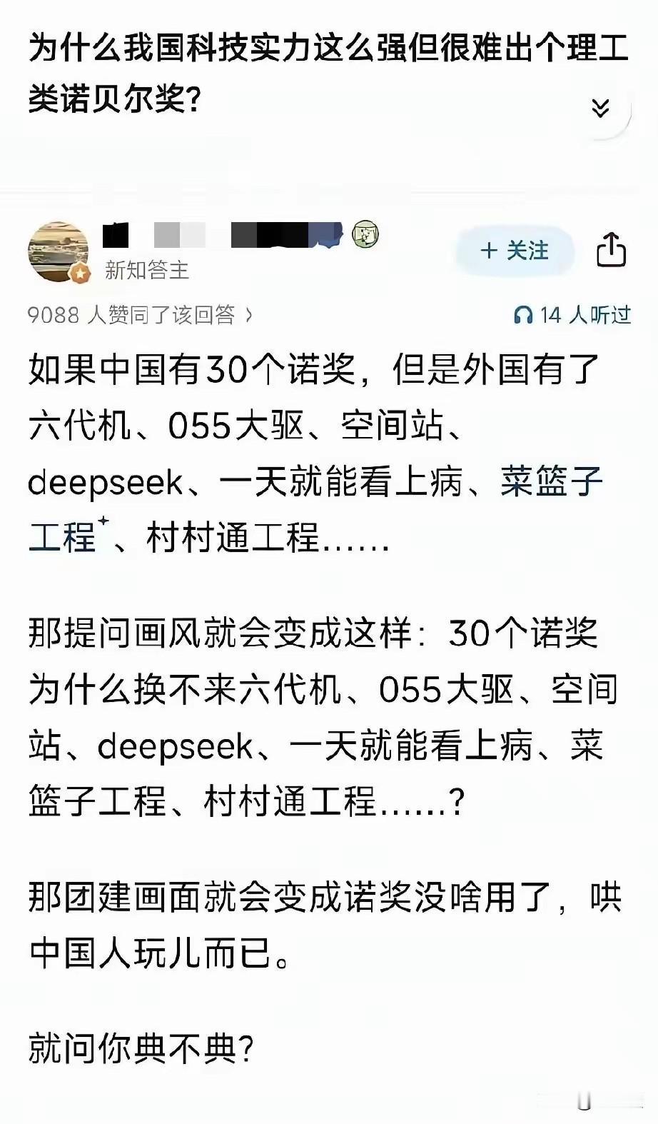 改革开放以来,我国的科技以高速的速度发展,我国的科技成果已经屹立世界之巅,但是我国截至目前,却没有获得一个理工类的诺贝尔奖。于是有网友在网络上发出了灵魂之问:为什么我国科技实力这么强但很难出理工类诺贝尔奖? 我国的科技的发展是集体的智慧,而不是某个人的单独成果,这是其一。其二,诺贝尔评委绝大部分是欧美科技工作者,他们对我们持有天然的偏见。诺贝尔奖不能当饭吃,但是我们的科技成果却可以保家卫国,可以成为我们与美国谈判的资本,这个就已经够够的了。