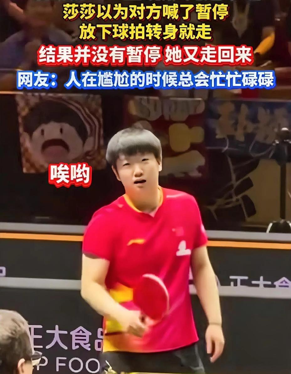 莎莎又承担了我一整天的“笑点”, 每场比赛都有可爱的一面。 北京大满贯孙颖莎对战队友王晓彤, 第三局比赛过程中, 莎莎看到对手放下球拍, 她以为要叫暂停, 立马放下球拍准备拿毛巾走人。 结果一扭头看到王晓彤在整理头发, 王晓彤还示意莎莎, 没有,我没有叫暂停。 莎莎一脸懵懵的感觉, 只是尴尬地笑了笑, 拿起球拍接着比赛。 好可爱的莎莎, 总是为队友着想, 她觉得王晓彤应该叫个暂停缓一缓。 要说比赛的时候, 还是短头发利索, 像莎莎一样就没有头发散落下来的烦恼。 (图片源自于网络)