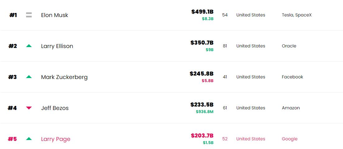 据《福布斯》实时富豪榜显示,截至美国东部时间10月1日下午4点15分,马斯克的净资产已达5001亿美元,比全球第二大富豪、美国软件公司甲骨文的创始人埃里森的个人资产多近1500亿美元。不过,随着特斯拉股价在当天美股尾盘涨幅收窄,马斯克的身价也出现缩水。截至当天收盘,马斯克身价约4991亿美元。