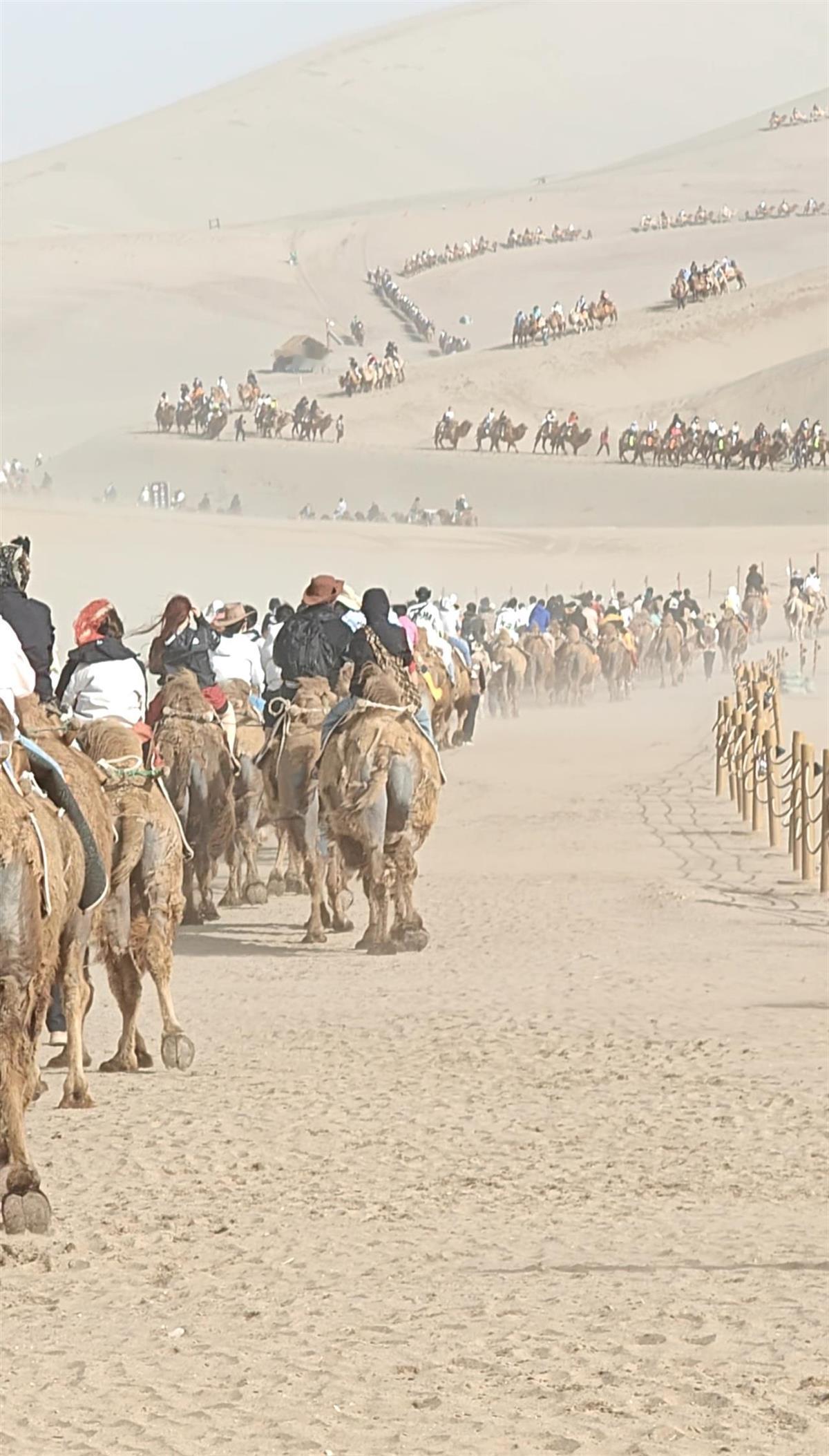 敦煌月牙泉爆了!骆驼也等红绿灯…… 奇观!奇观!沙丘之上人潮涌动,沙漠之中驼队"堵车",遵守红灯停,绿灯行。这个假期,敦煌鸣沙山月牙泉景区又火出圈了,一眼望去的沙丘上坐满了游客,爬梯上还有不断向上攀登的人群。而一旁蜿蜒数里的骆驼大队再次上演“堵骆驼”奇观,场面堪比城市早高峰。来自山东的徐女士惊喜地说:“第一次看到骑骆驼还要等红绿灯,这体验太新奇了!” 根据景区工作人员介绍,骆驼骑行一趟约40分钟,5人一队,由工作人员指引带队。下午高峰期时,想骑骆驼得排队半小时左右。除了传统的沙漠项目,景区还准备了丰富多彩的活动。十一期间,万人星空演唱会在月牙泉畔举行。10月1日的“落日合唱派对”上,1500架无人机在夜空中变幻出爱国红心、丝路驼队等图案,数万名游客在沙漠中共唱《我爱你中国》。这么嗨的地方,能玩儿大漠滑沙,驼铃声声,谁不想去感受一下异域风情? 据景区介绍,10月6日还有一场特别活动,70年代的人最喜欢的歌手莫文蔚,将携乐队亮相演唱《忽然之间》等经典曲目。 这个假期,你去敦煌感受大漠风情了吗?